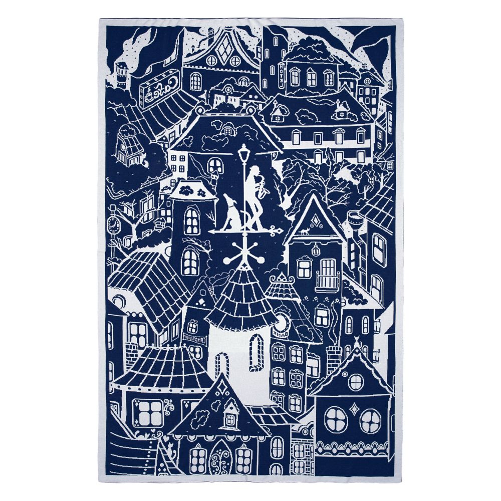 Плед с вывязанным логотипом и индивидуальным рисунком в фирменной цветовой гамме.