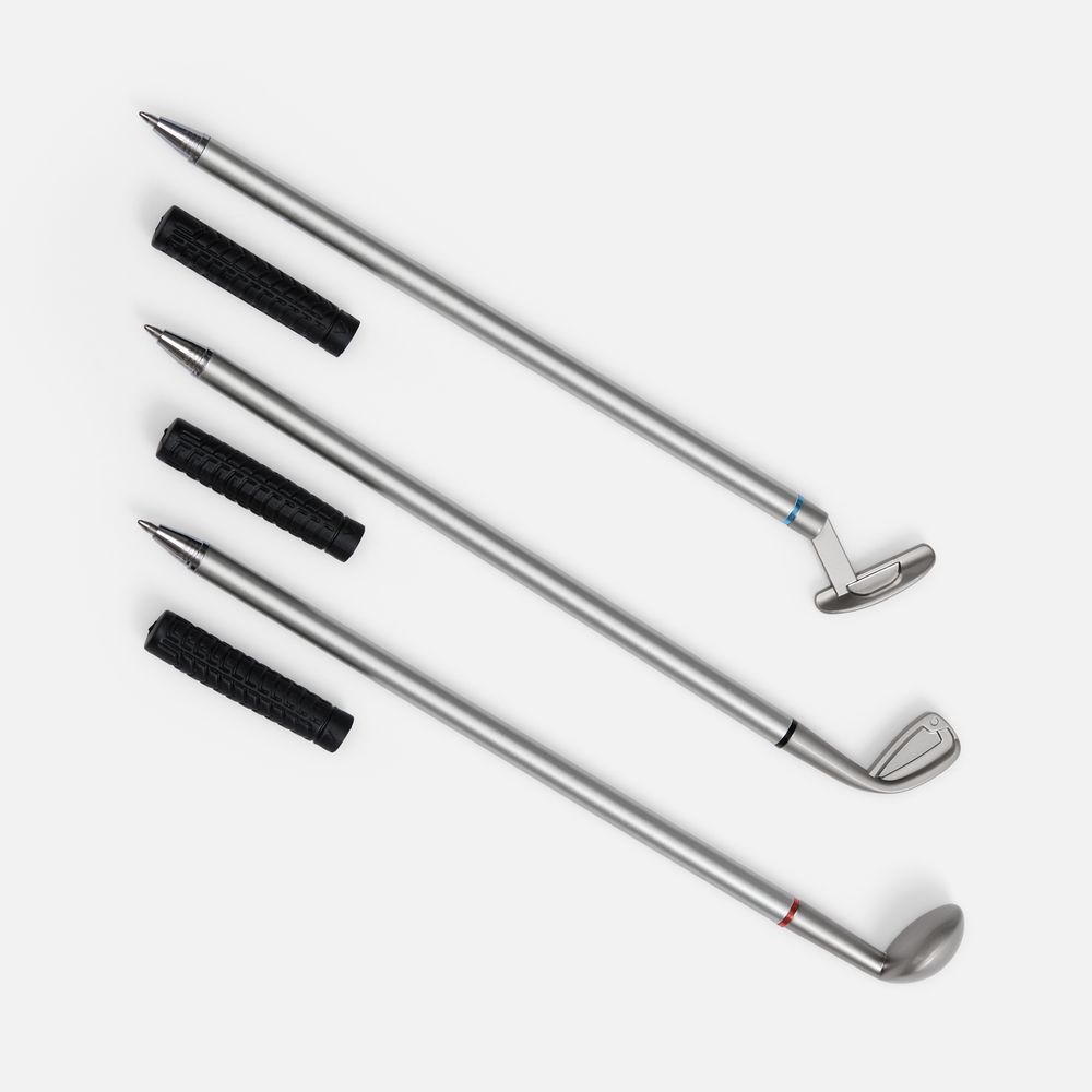 Если с клюшек снять резиновые колпачки, то клюшки превратятся в элегантные пишущие ручки, при этом у каждой ручки свой цвет чернил: черный, красный, синий.