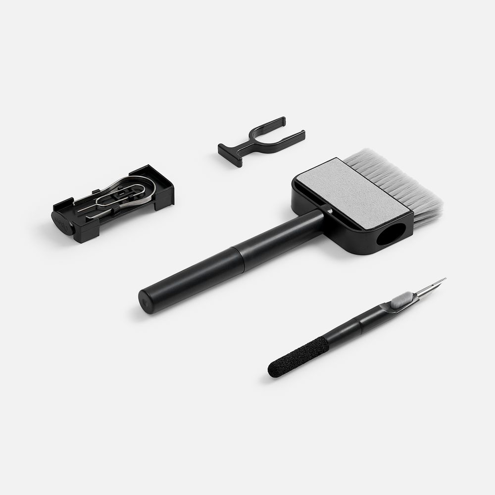 Набор предназначен для всех типов гаджетов. Инструменты компактно складываются внутрь большой щетки.