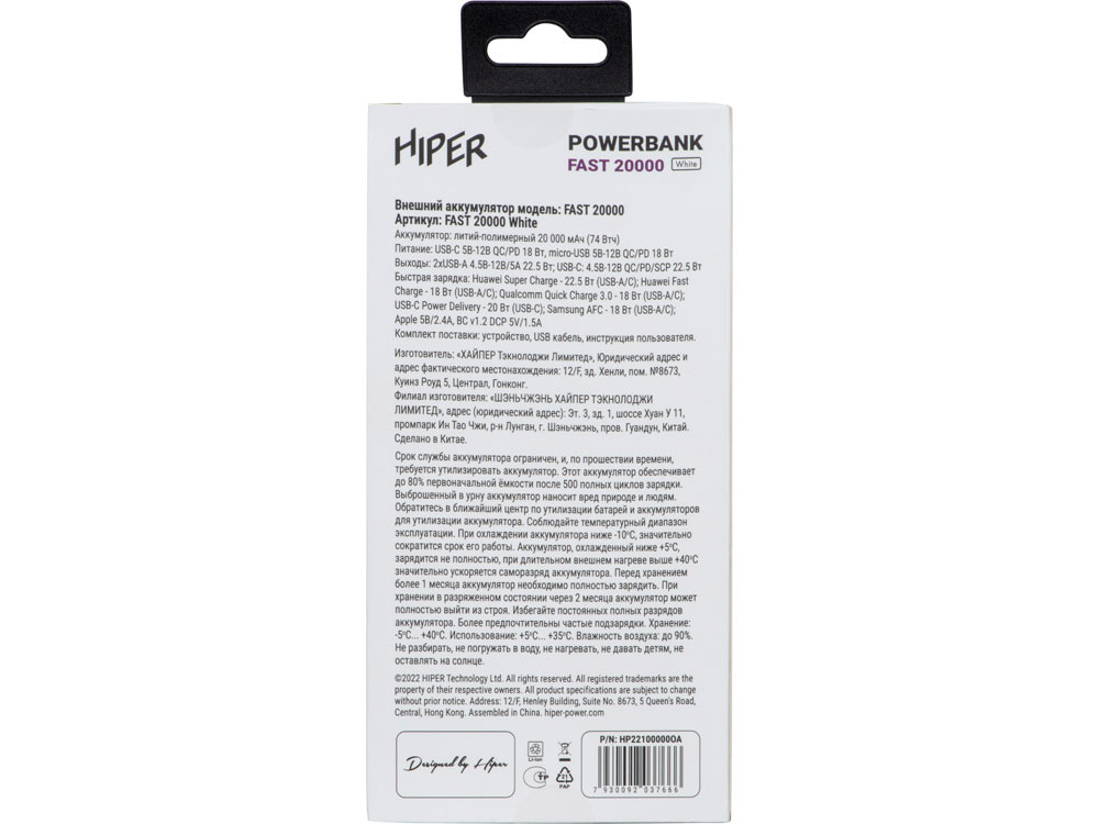 Портативный внешний аккумулятор HIPER FAST 20000 емкостью 20000 мАч (74Втч) оснащён двунаправленным портом USB-C, Micro-USB входом для зарядки, с поддержкой быстрой зарядки аккумулятора QC и PD, 2xUSB-A выходами, максимальный выходной ток 5А, максимальная мощность 22,5 Вт, поддержка быстрой зарядки стандарта QC 18 Вт, поддержка быстрой зарядки стандарта PD 18 Вт, стильный дизайн. УФ-печать (УФ-печать белые изделия) на данный товар осуществляется бесплатно. Оплачивается только настройка оборудования в размере 2000 рублей на весь тираж.
