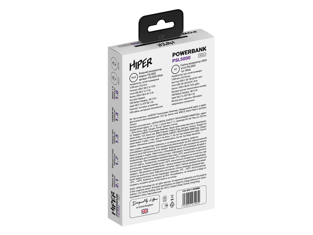Портативный внешний литий-ион полимерный аккумулятор HIPER PSL5000 White емкостью 5000 мАч (18,5Втч) оснащён входом USB-C для зарядки, Micro-USB входом для зарядки, 2xUSB-A выходами, максимальный выходной ток 2,1А, максимальная мощность 12 Вт, тонкий корпус. Тампопечать (1 цвет (белые изделия)) на данный товар осуществляется бесплатно. Оплачивается только настройка оборудования в размере 4500 рублей на весь тираж.
