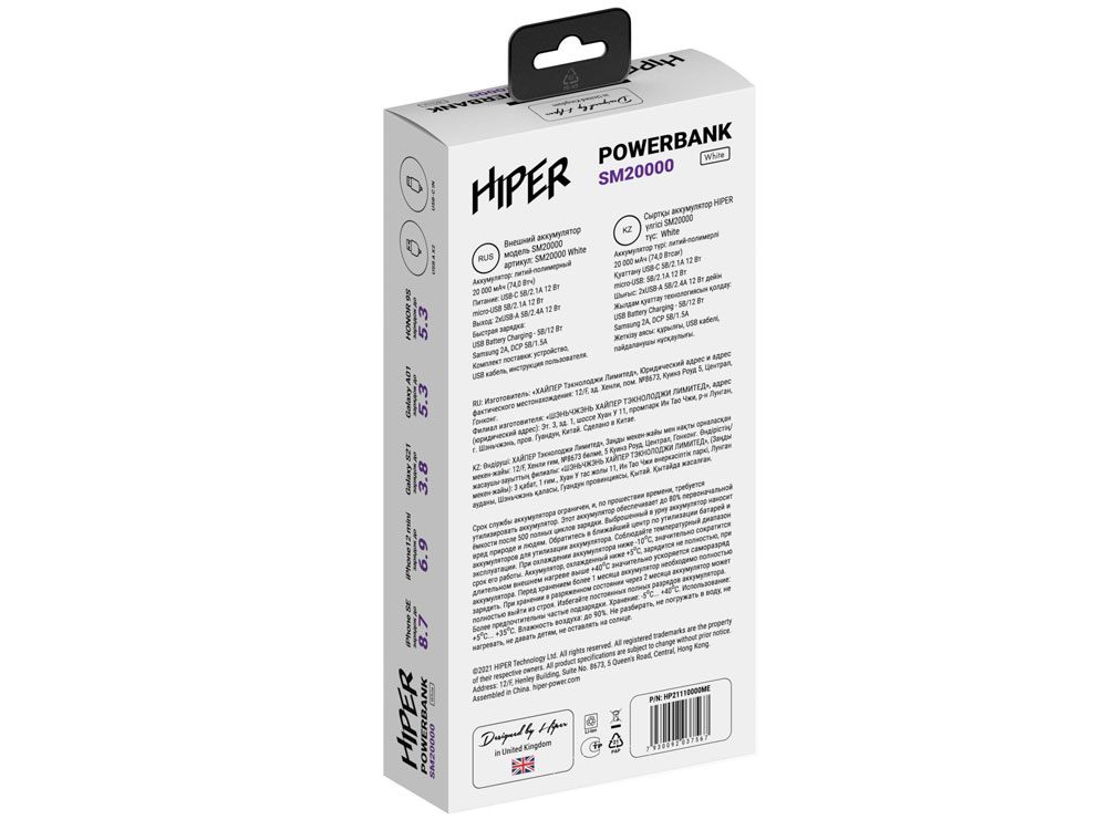 Портативный внешний аккумулятор HIPER SM20000 емкостью 20000 мАч (74Втч) оснащён входом USB-C для зарядки, Micro-USB входом для зарядки, 2xUSB-A выходами, максимальный выходной ток 2,1А, максимальная мощность 12 Вт. Тампопечать (1 цвет (белые изделия)) на данный товар осуществляется бесплатно. Оплачивается только настройка оборудования в размере 4500 рублей на весь тираж.