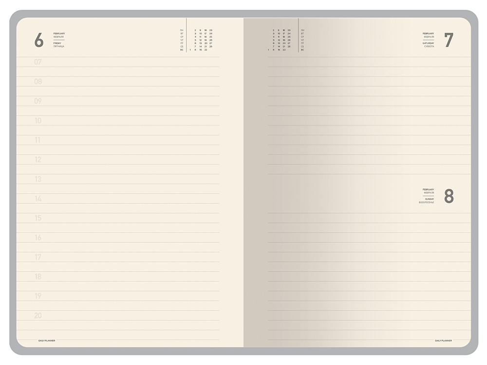 Элегантный датированный ежедневник "Megapolis Color" от Bruno Visconti идеально подходит для организации рабочего дня и ведения важных записей. Обложка из искусственной кожи с приятным на ощупь покрытием Soft Touch и обрез в тон создают гармоничный образ. Внутри – блок из бежевой бумаги плотностью 70 г/кв.м с разделами для планирования, календарем на 2026-2027 год и полезной справочной информацией. Для удобства навигации предусмотрена закладка-ляссе шириной 7 мм в цвет обложки. Тиснение (Блинт) на данный товар осуществляется бесплатно. Оплачивается только настройка оборудования в размере 6200 рублей на весь тираж.