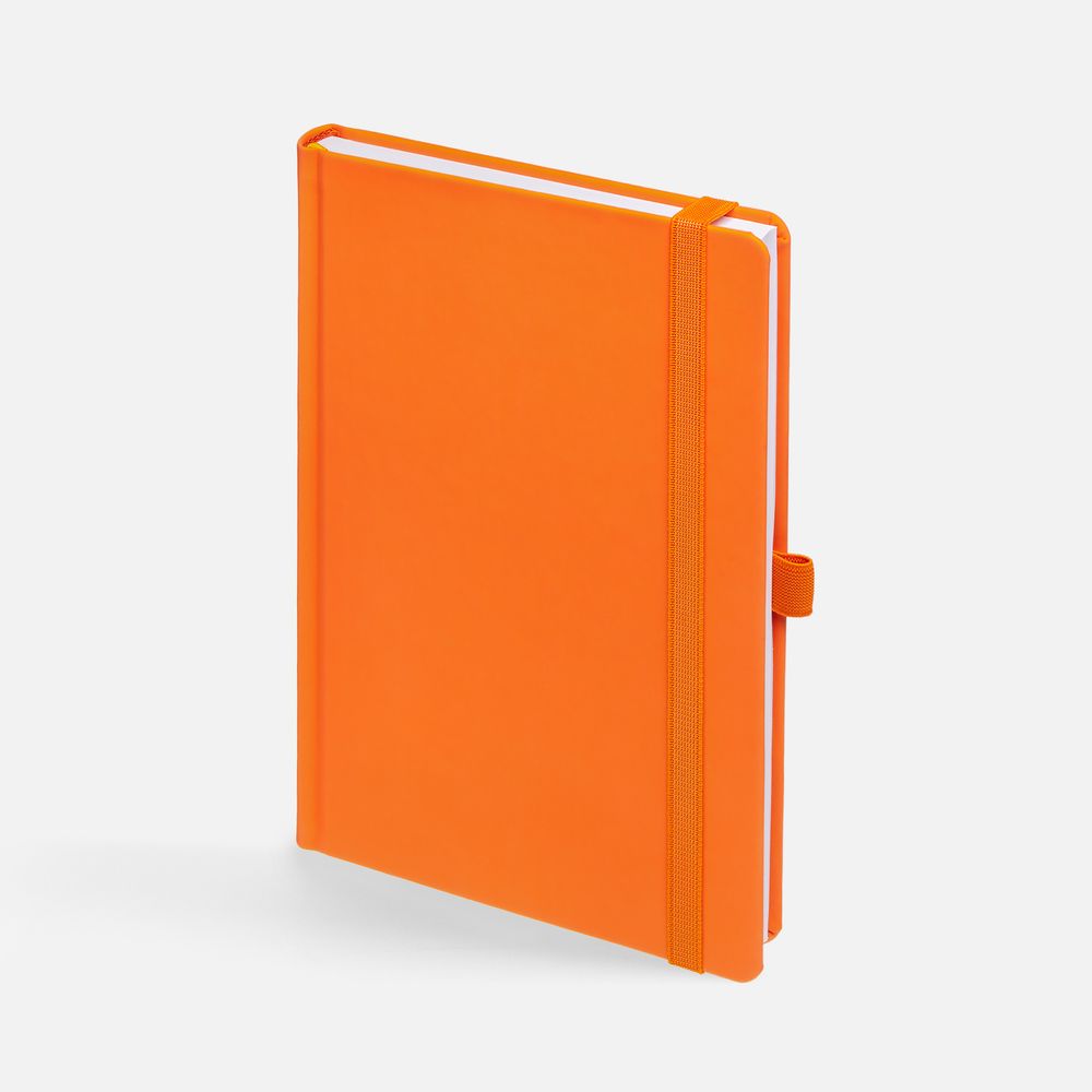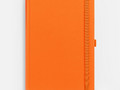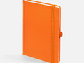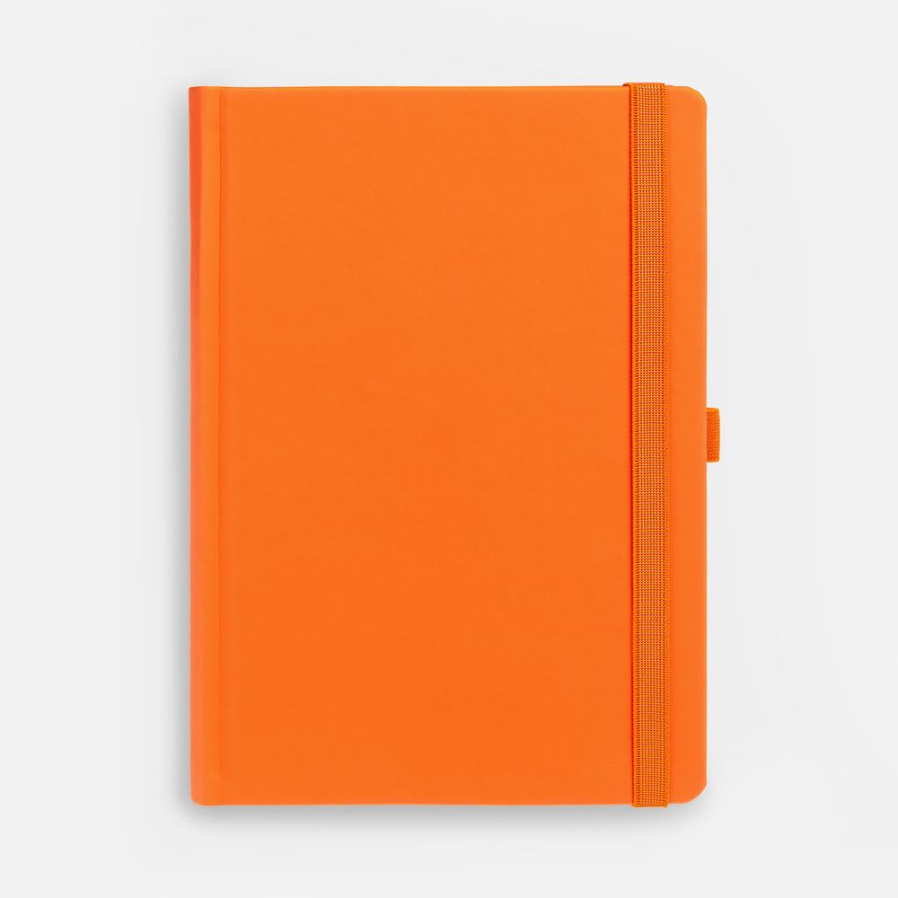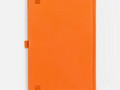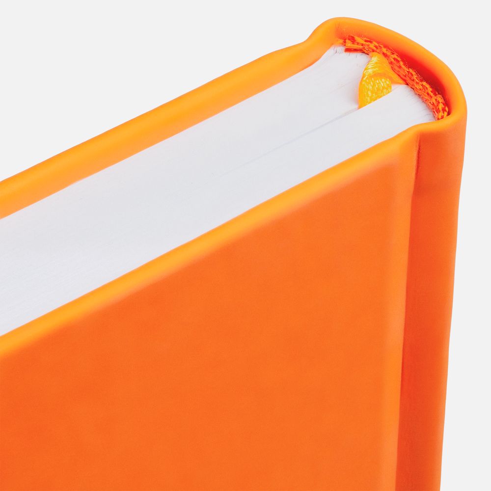 Ежедневник с твердой обложкой без поролона, выполнен из материала Soft Touch, оранжевый ОО, дополнен резинкой шириной 1 см, петлей-резинкой для ручки, капталом и ляссе оранжевого цвета.