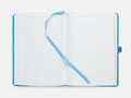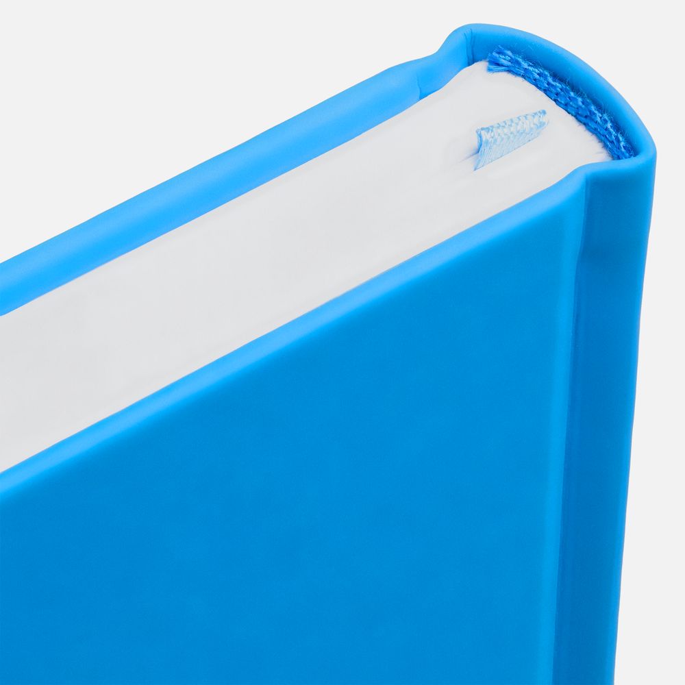 Ежедневник с твердой обложкой без поролона, выполнен из материала Soft Touch Ultra, голубой JJ, дополнен резинкой шириной 1 см, петлей-резинкой для ручки, капталом и ляссе голубого цвета.