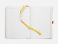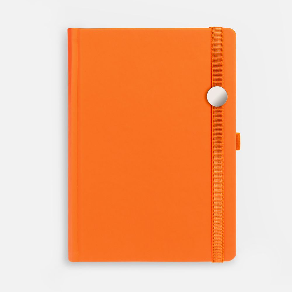 Ежедневник с твердой обложкой без поролона, выполнен из материала Soft Touch, оранжевый ОО, дополнен резинкой шириной 1 см, петлей-резинкой для ручки, капталом и ляссе оранжевого цвета.