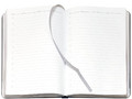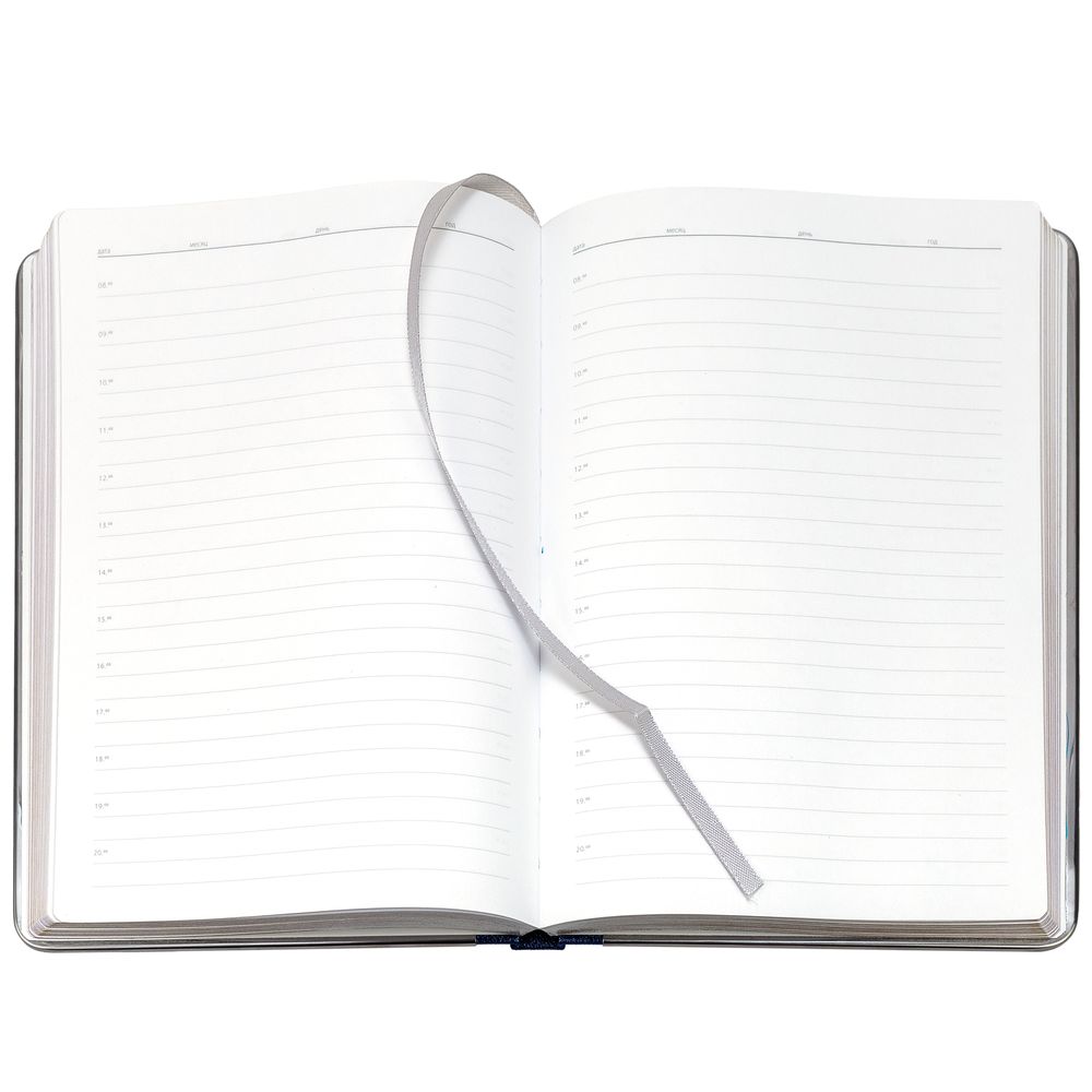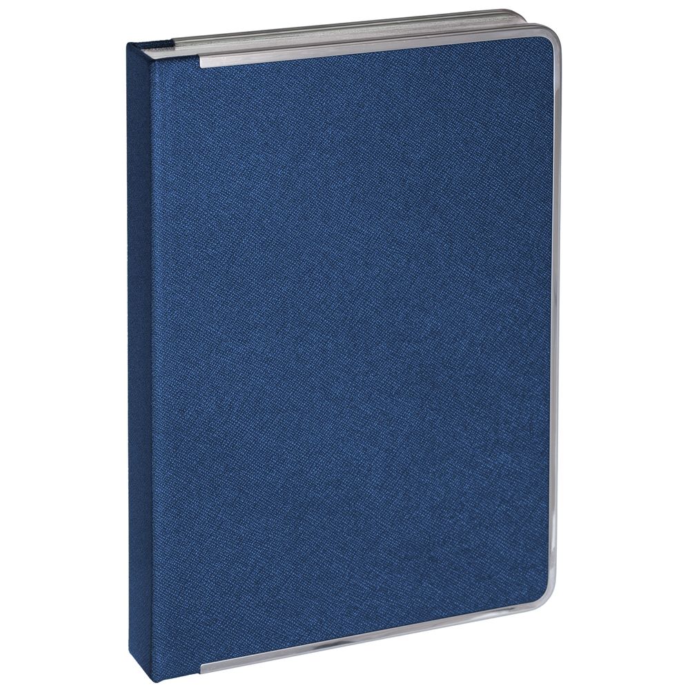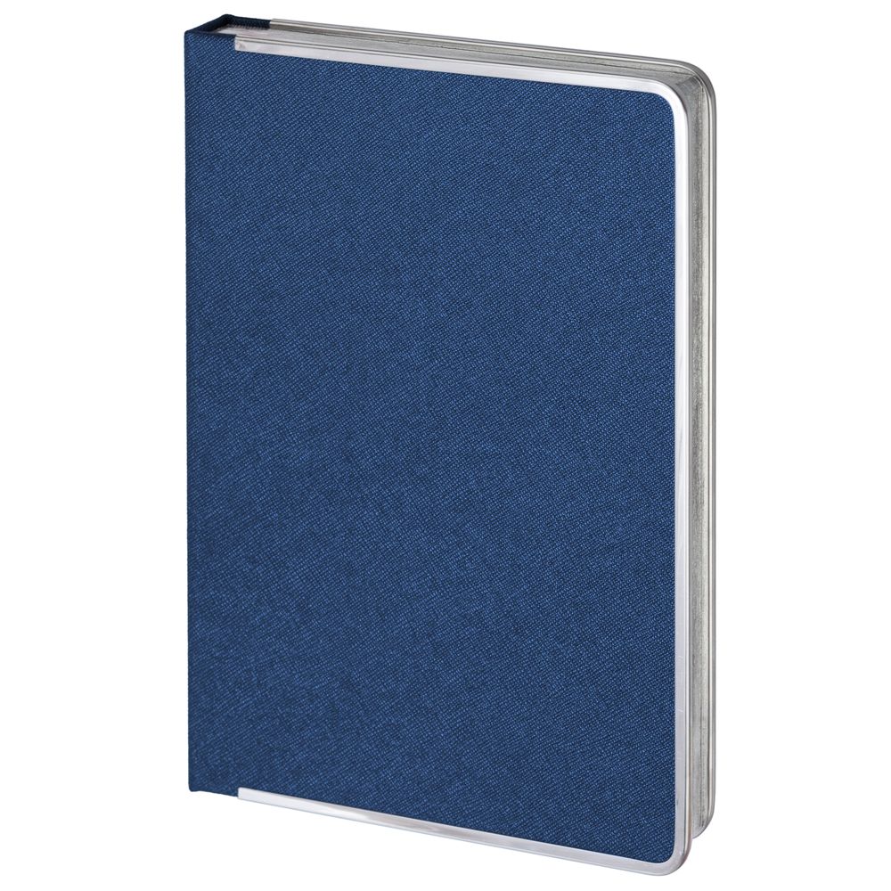 Ежедневник с твердой обложкой и серебристым обрезом, выполнен из материала Saffian, синий, дополнен серым ляссе и металлическими рамками.