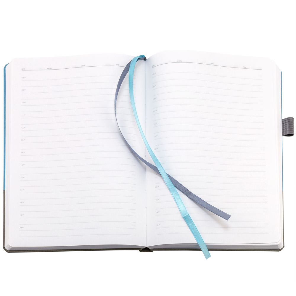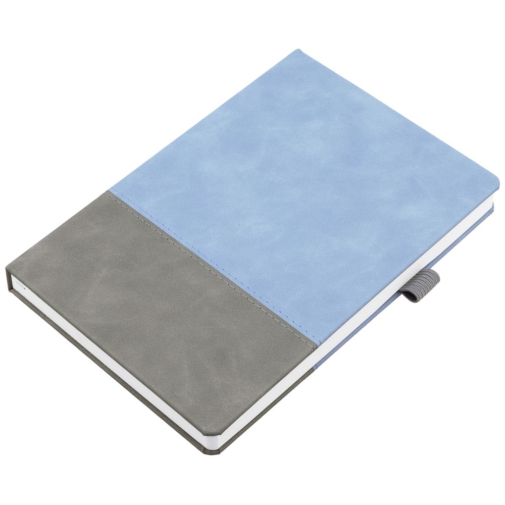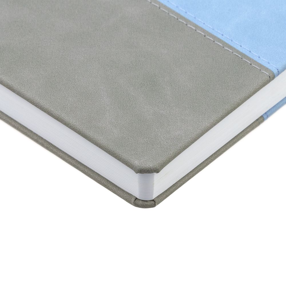 Ежедневник с твердой обложкой, без поролона, со сшивкой материалов Nubuck Touch, серый СС, и Nubuck Touch голубой JJ, дополнен двойным ляссе и петлей-резинкой для ручки.