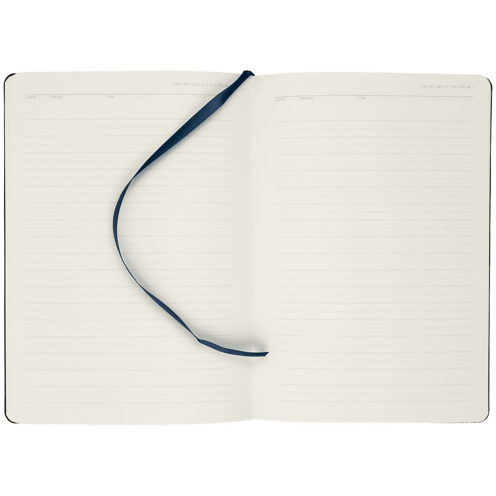 Ежедневник с гибкой обложкой, выполнен из материала Latte, темно-синий, дополнен ляссе в цвет обложки.