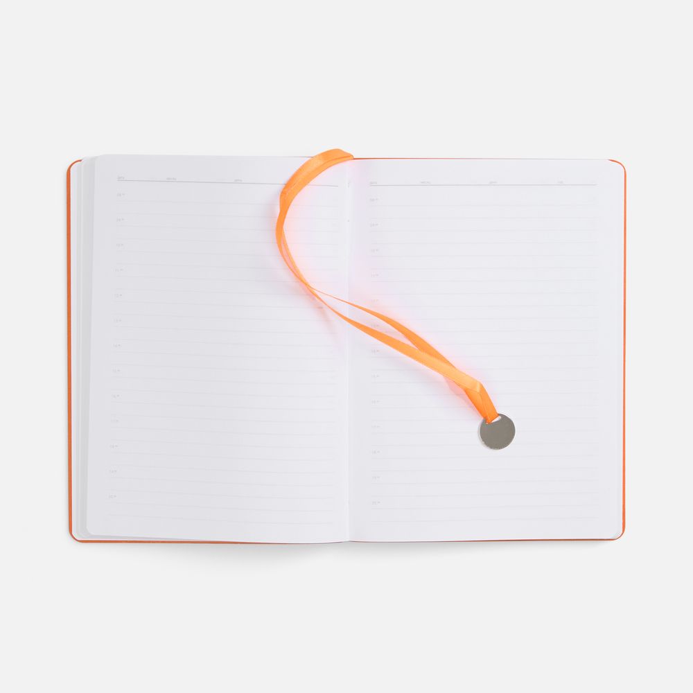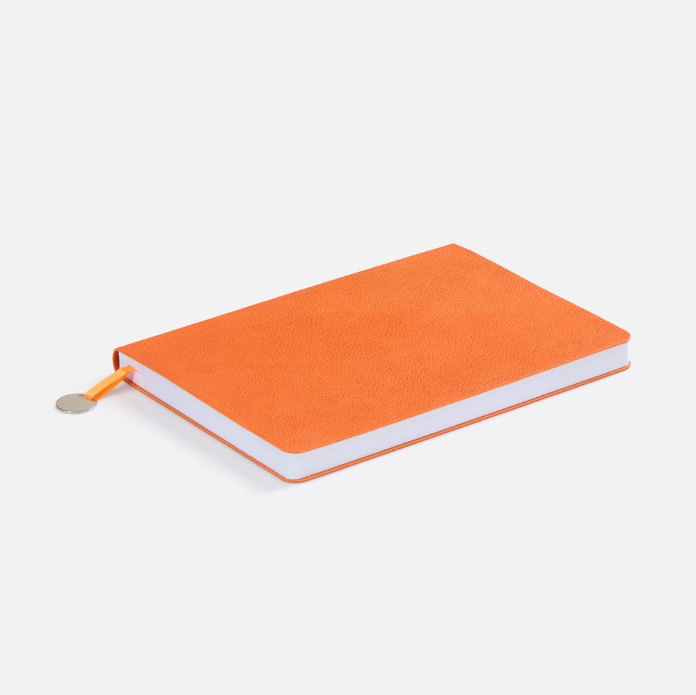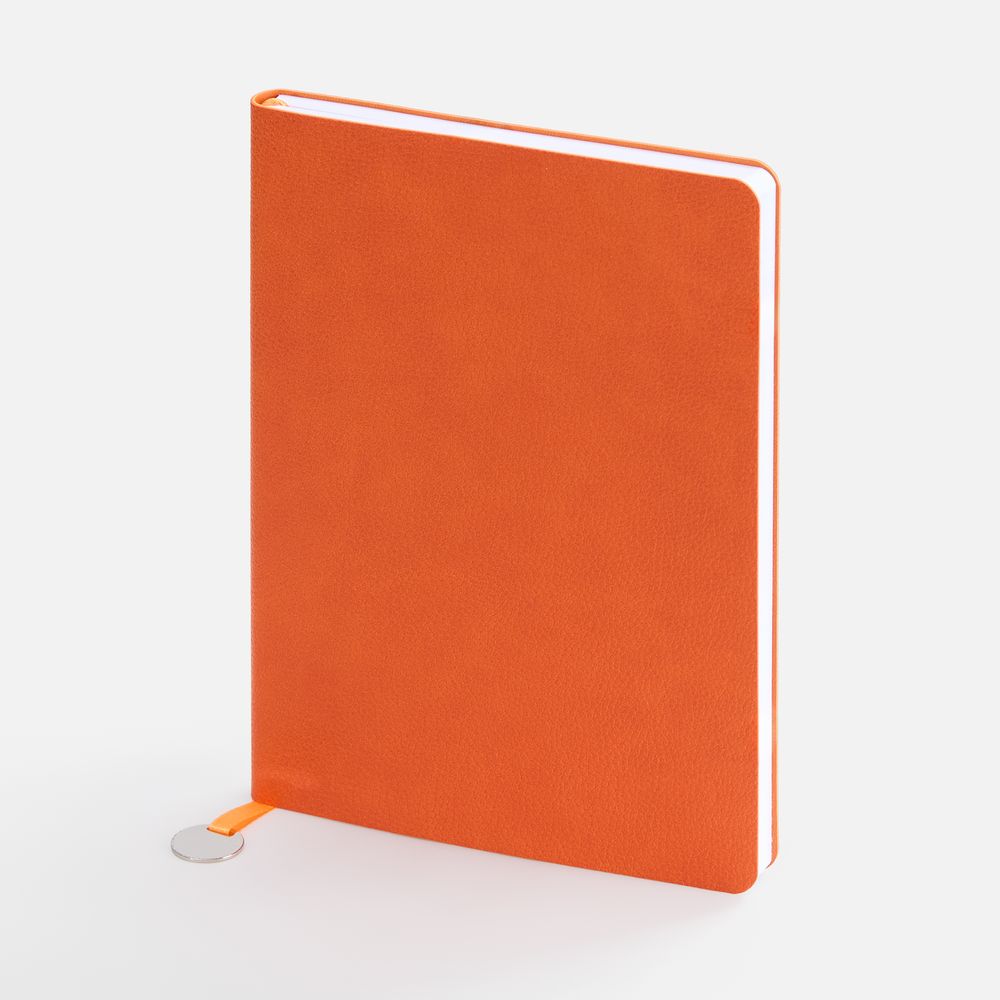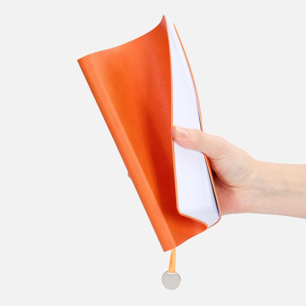 Ежедневник с гибкой обложкой, выполнен из материал La Fite, оранжевый ОО, дополнен ляссе в цвет обложки с металлическим шильдом.
