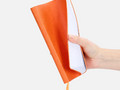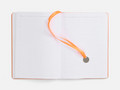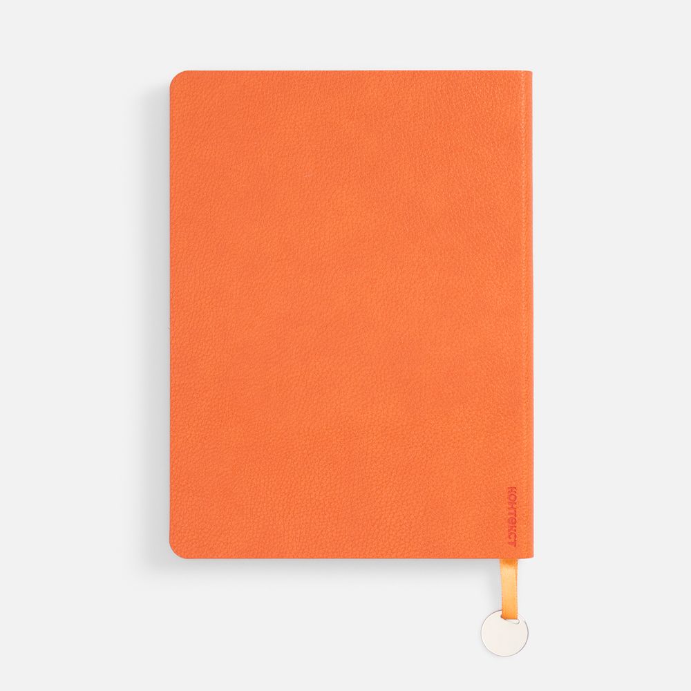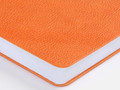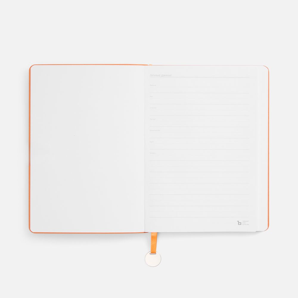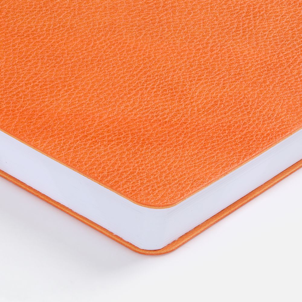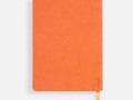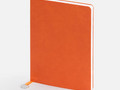 Ежедневник с гибкой обложкой, выполнен из материал La Fite, оранжевый ОО, дополнен ляссе в цвет обложки с металлическим шильдом.