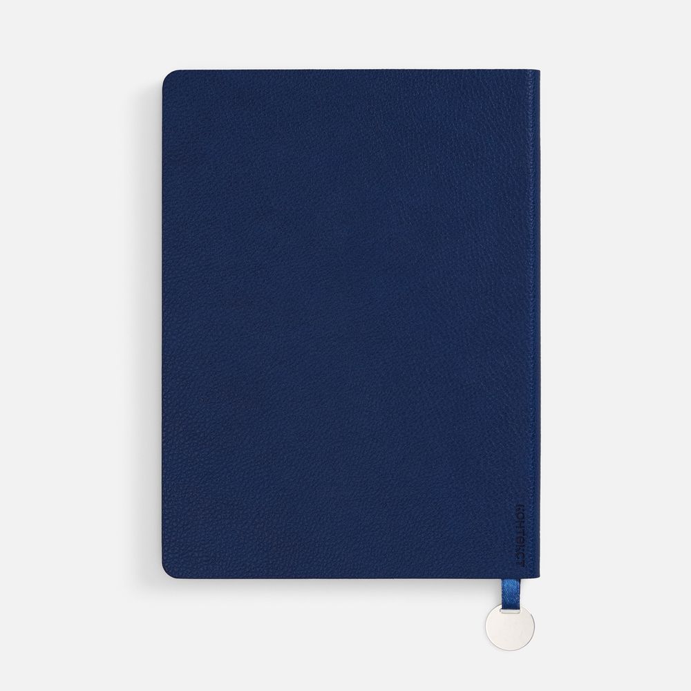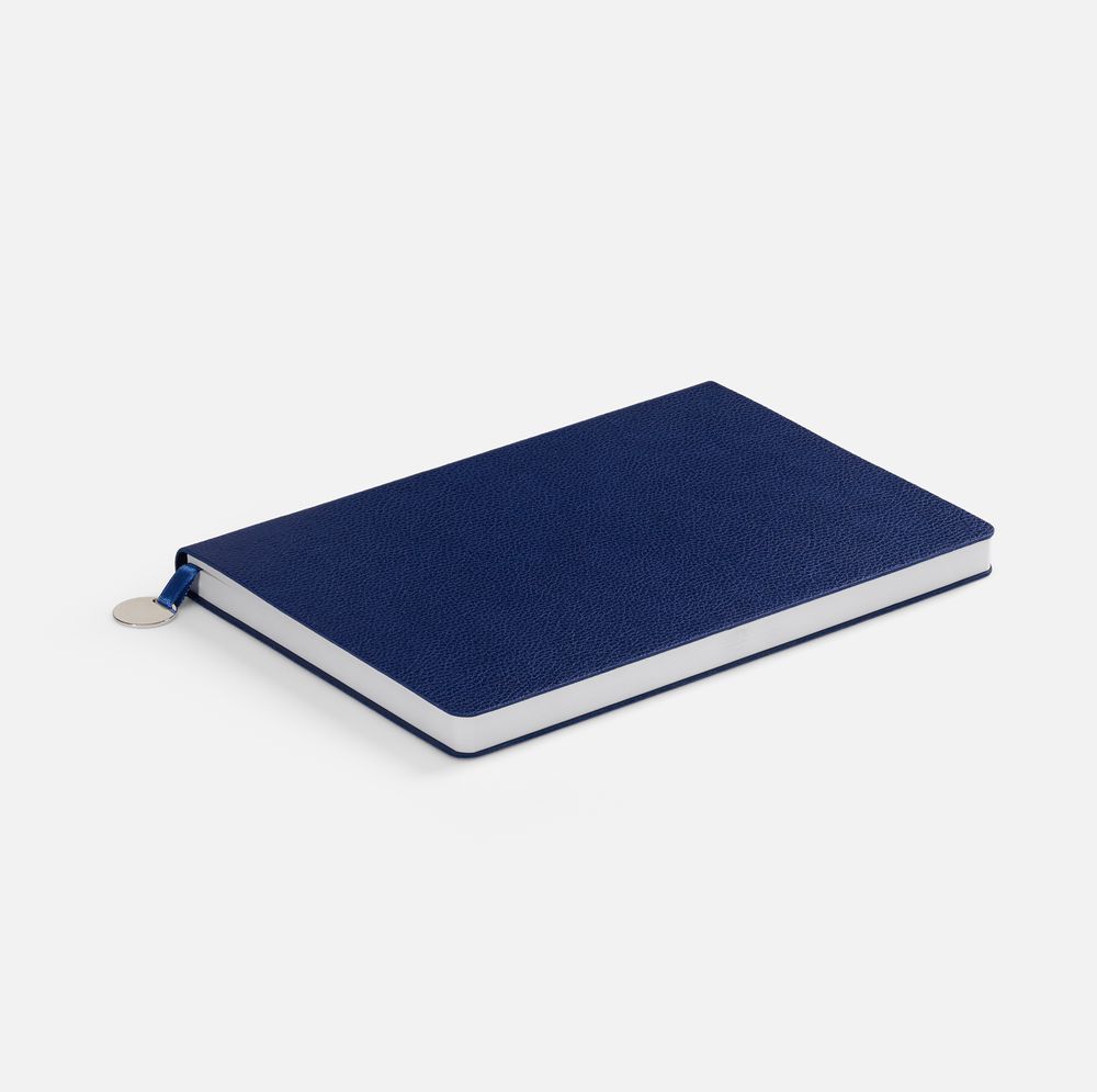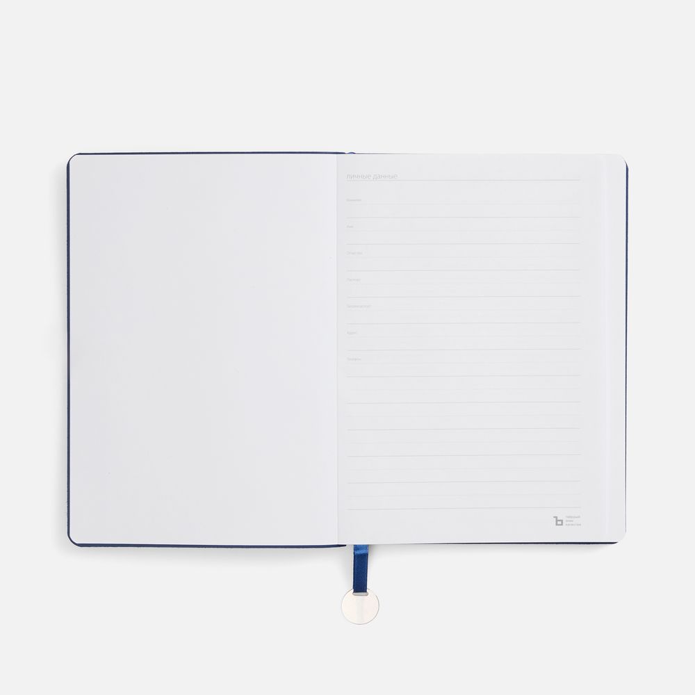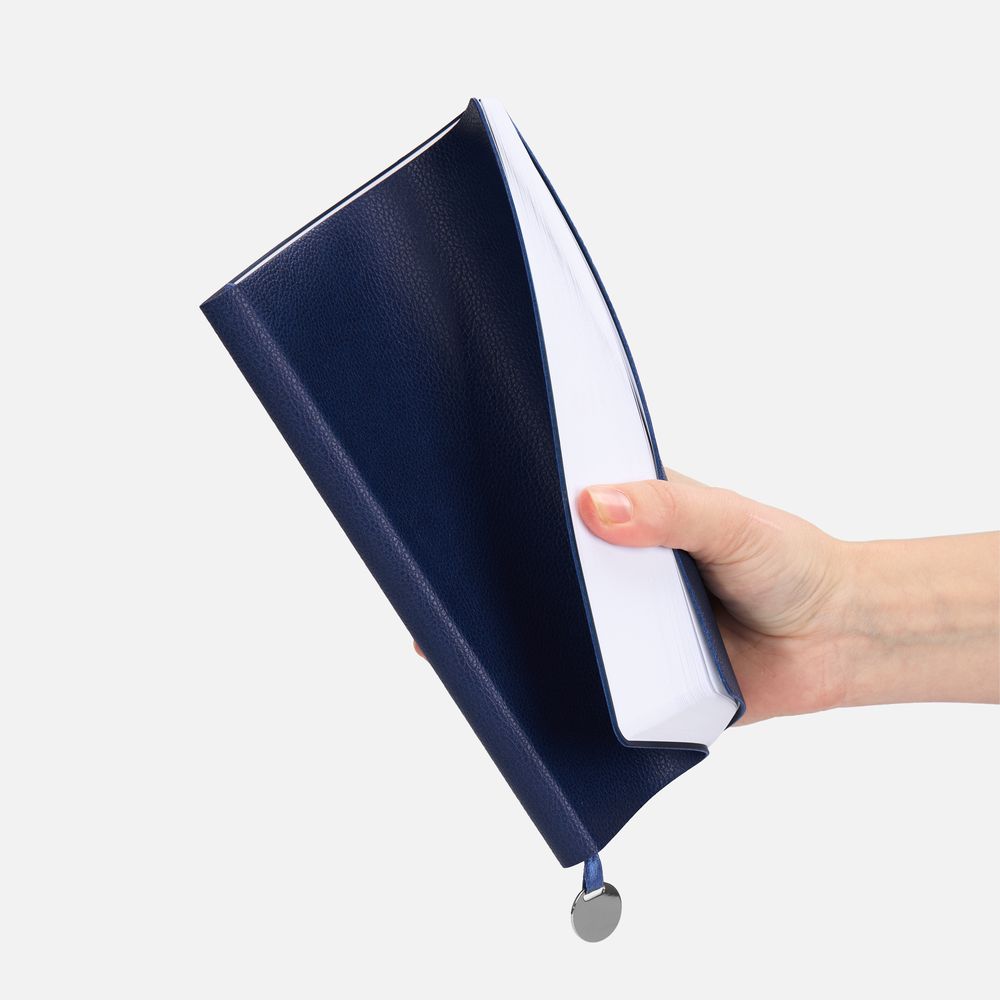 Ежедневник с гибкой обложкой, выполнен из материал La Fite, синий НН, дополнен ляссе в цвет обложки с металлическим шильдом.
