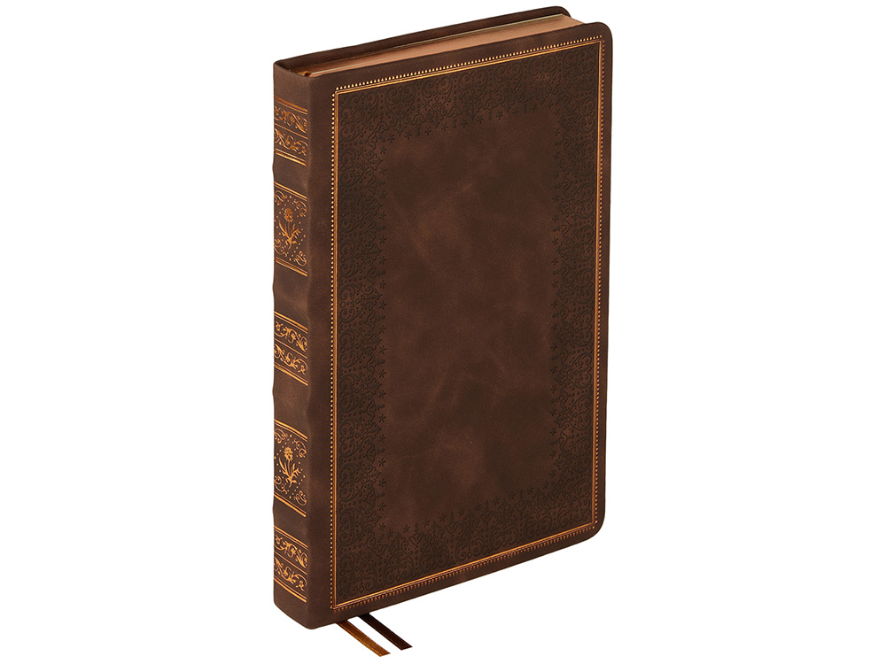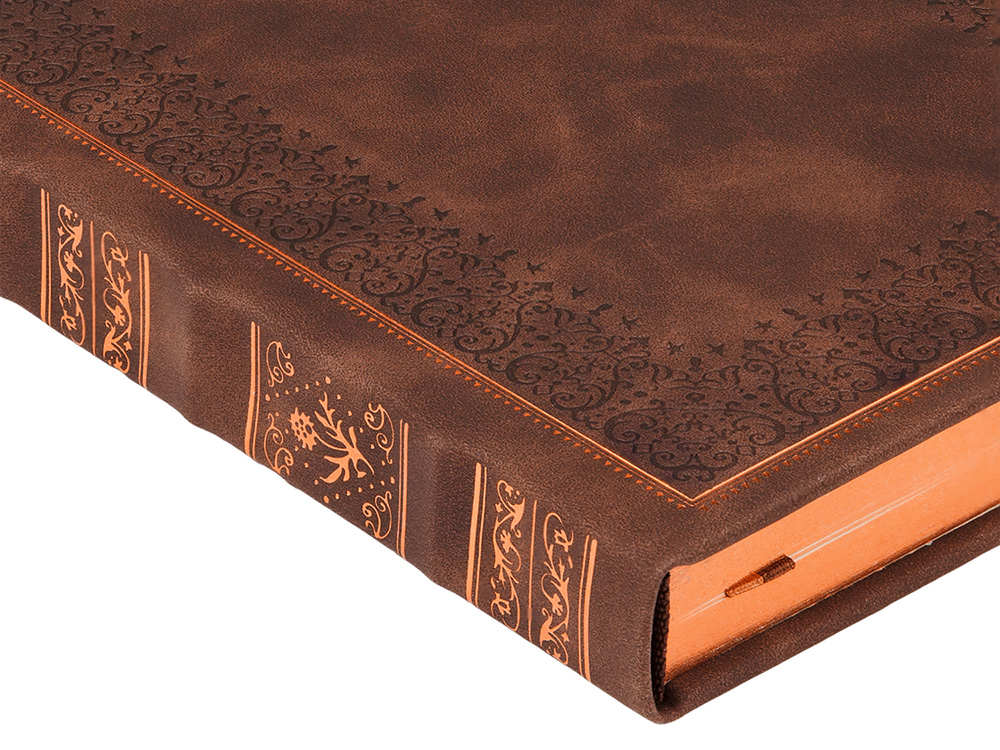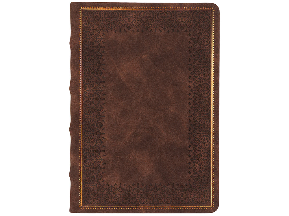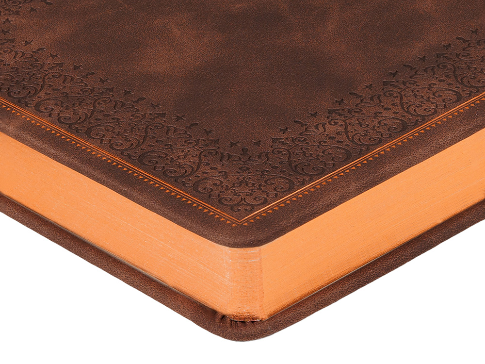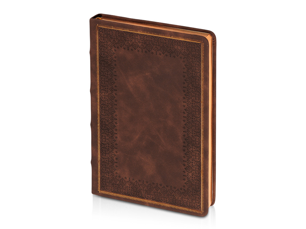Недатированный ежедневник "Royal" формата А5 с твердой обложкой из искусственной кожи с имитацией нубука украшен художественным бронзовым и блинтовым тиснением. Внутри 256 страниц, выполненных из качественной бежевой бумаги в линейку плотностью 100 г/м². Два шелковых ляссе в цвет обреза блока и обложки облегчают навигацию по записям. Французский корешок дополнительно декорирован изящным бронзовым тиснением в виде виньеток. Скругленные углы обложки и блока подчеркивают стильный дизайн изделия, а блеск бронзового обреза дарит ежедневнику благородный и роскошный внешний вид. Тиснение (Блинт) на данный товар осуществляется бесплатно. Оплачивается только настройка оборудования в размере 8700 рублей на весь тираж.