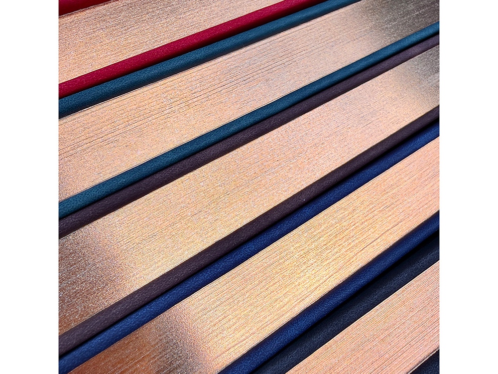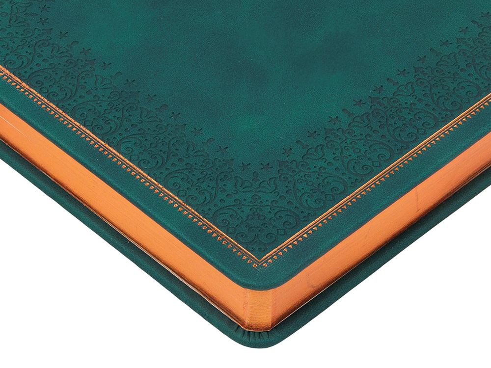 Недатированный ежедневник "Royal" формата А5 с твердой обложкой из искусственной кожи с имитацией нубука украшен художественным бронзовым и блинтовым тиснением. Внутри 256 страниц, выполненных из качественной бежевой бумаги в линейку плотностью 100 г/м². Два шелковых ляссе в цвет обреза блока и обложки облегчают навигацию по записям. Французский корешок дополнительно декорирован изящным бронзовым тиснением в виде виньеток. Скругленные углы обложки и блока подчеркивают стильный дизайн изделия, а блеск бронзового обреза дарит ежедневнику благородный и роскошный внешний вид. Тиснение (Блинт) на данный товар осуществляется бесплатно. Оплачивается только настройка оборудования в размере 8700 рублей на весь тираж.