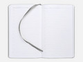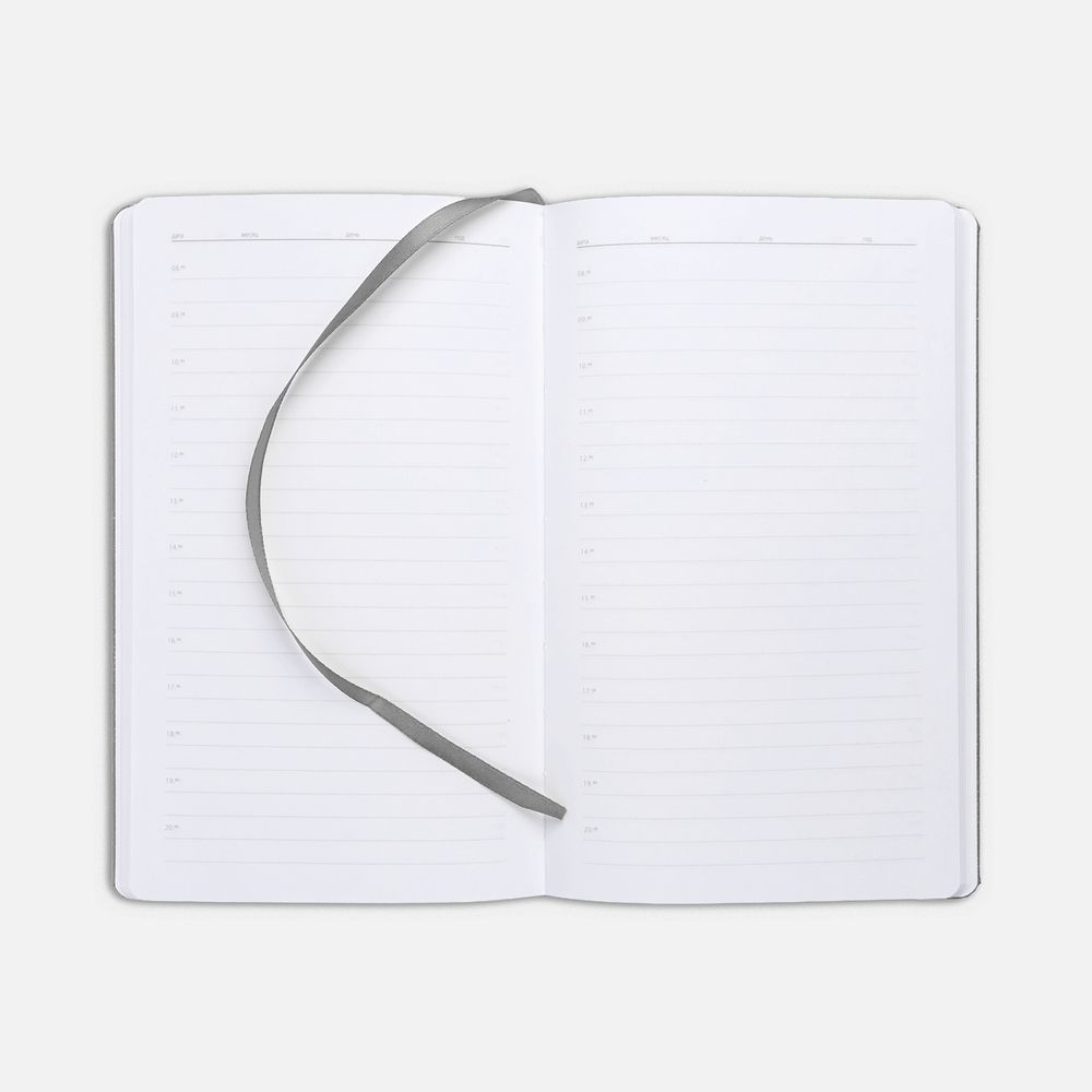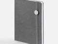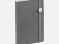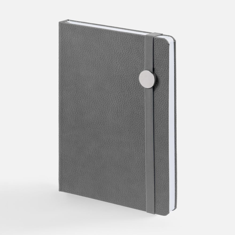 Зауженный ежедневник с круглым металлическим шильдом на резинке.