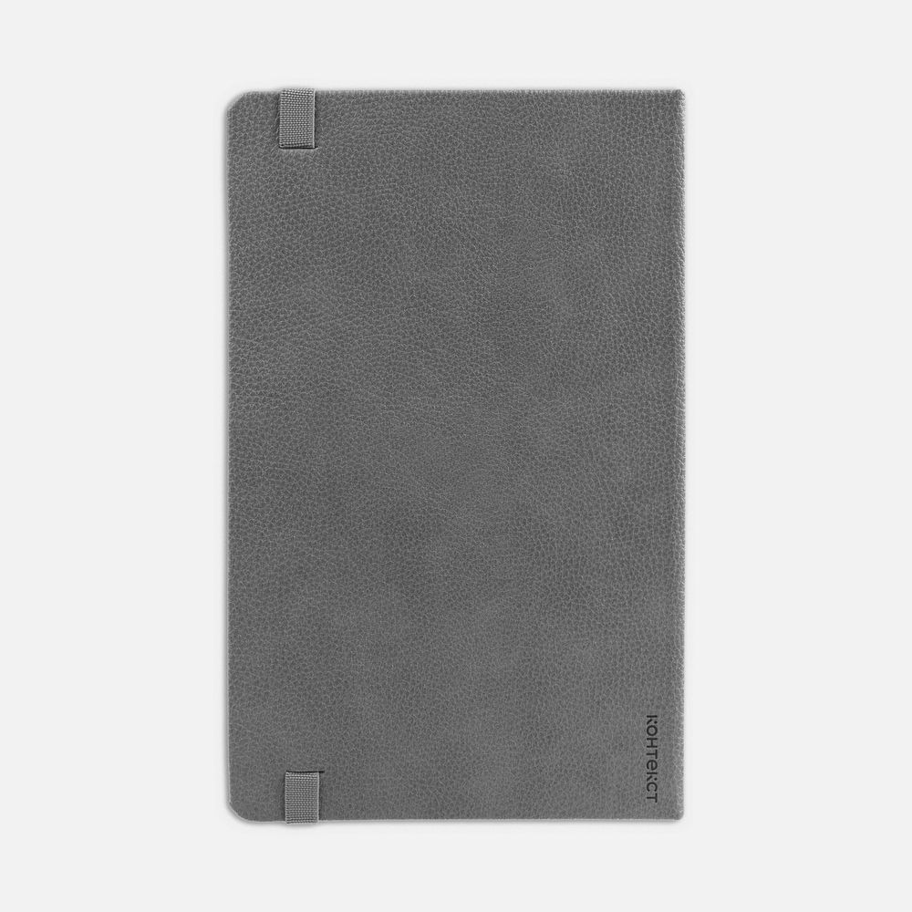 Ежедневник с твердой обложкой, выполнен из материала LaFite, серый СС, дополнен резинкой с металлическим круглым шильдом и ляссе в цвет обложки.