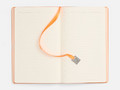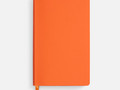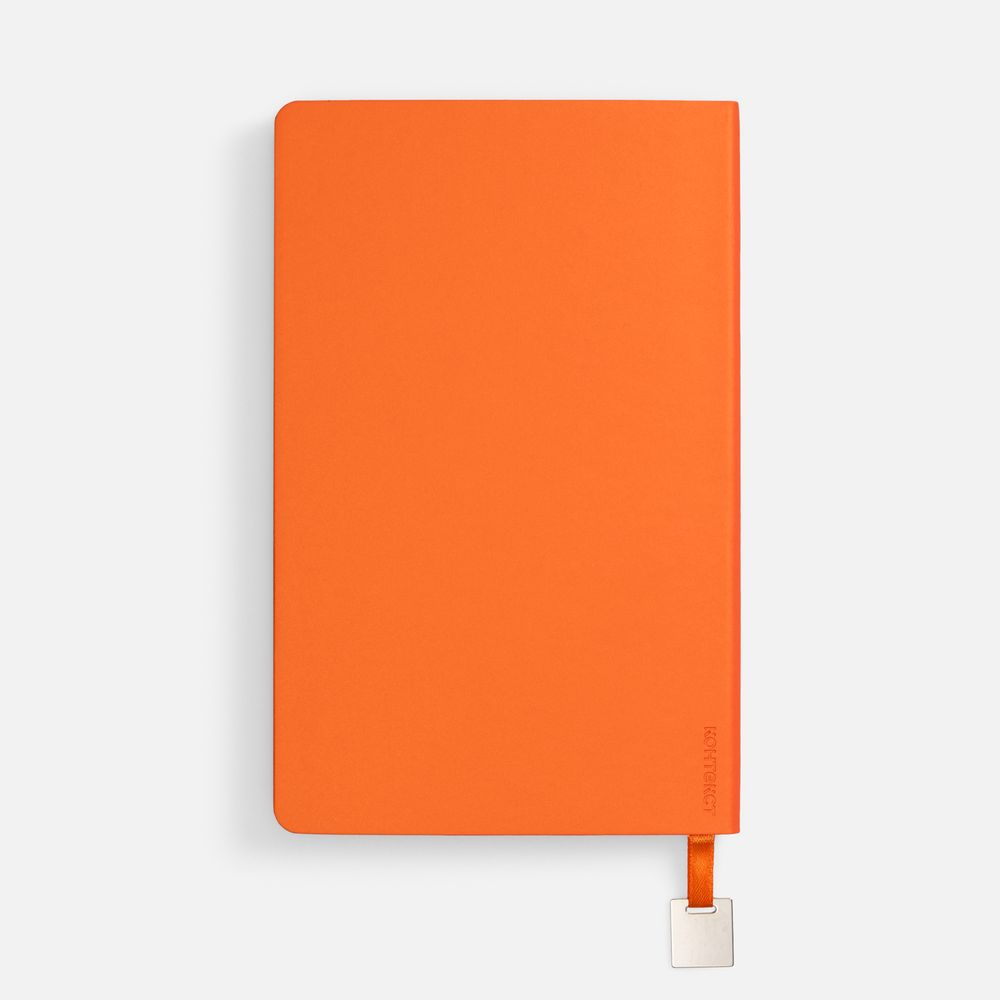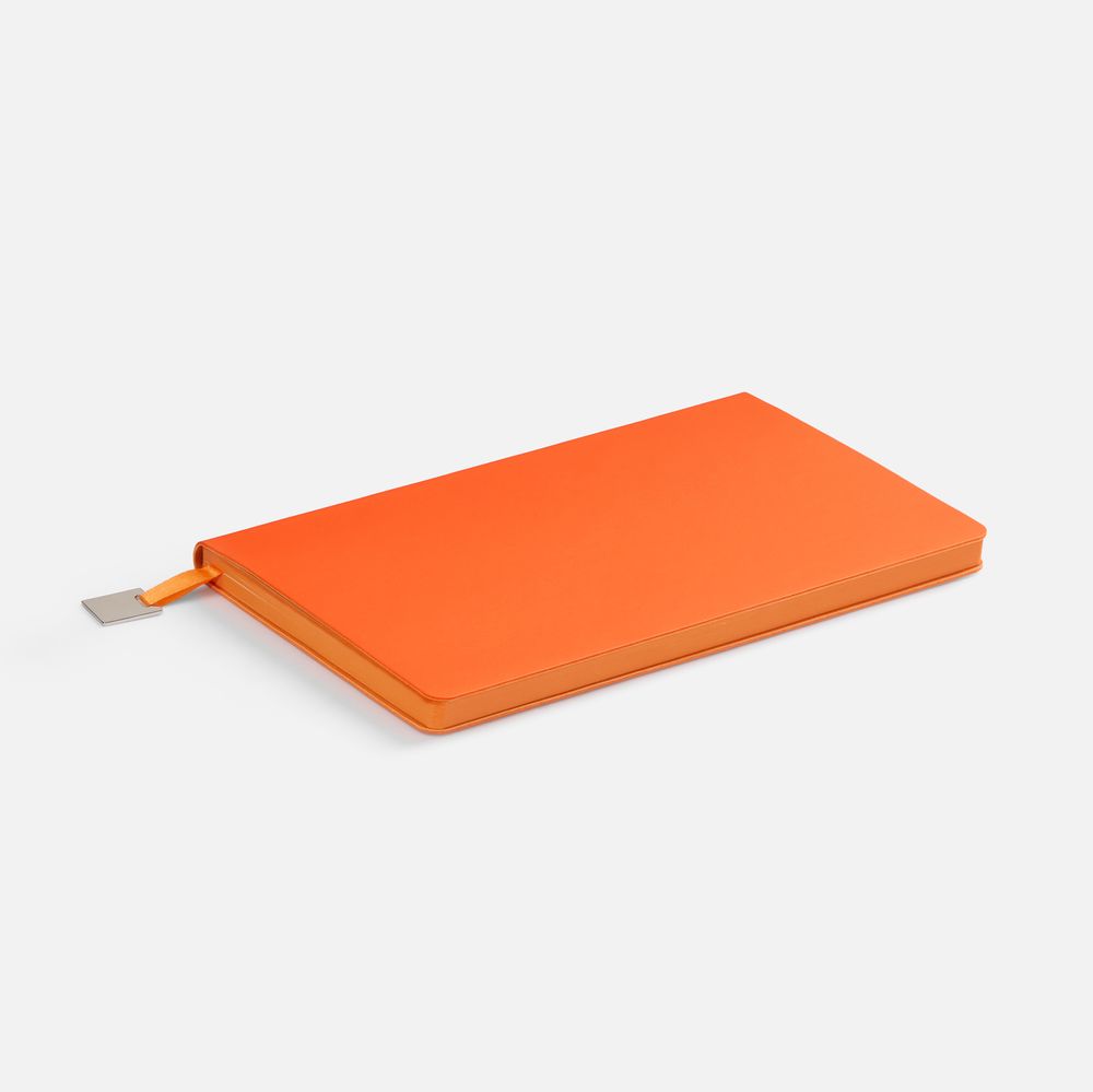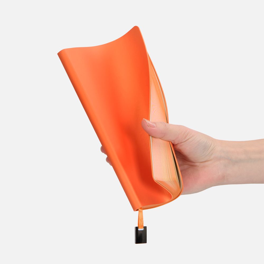 Ежедневник с гибкой обложкой, выполнен из материалов Soft Touch Pearl, оранжевый ОО, и Latte, оранжевый (внутренняя часть обложки), дополнен ляссе в цвет обложки с металлическим шильдиком.