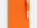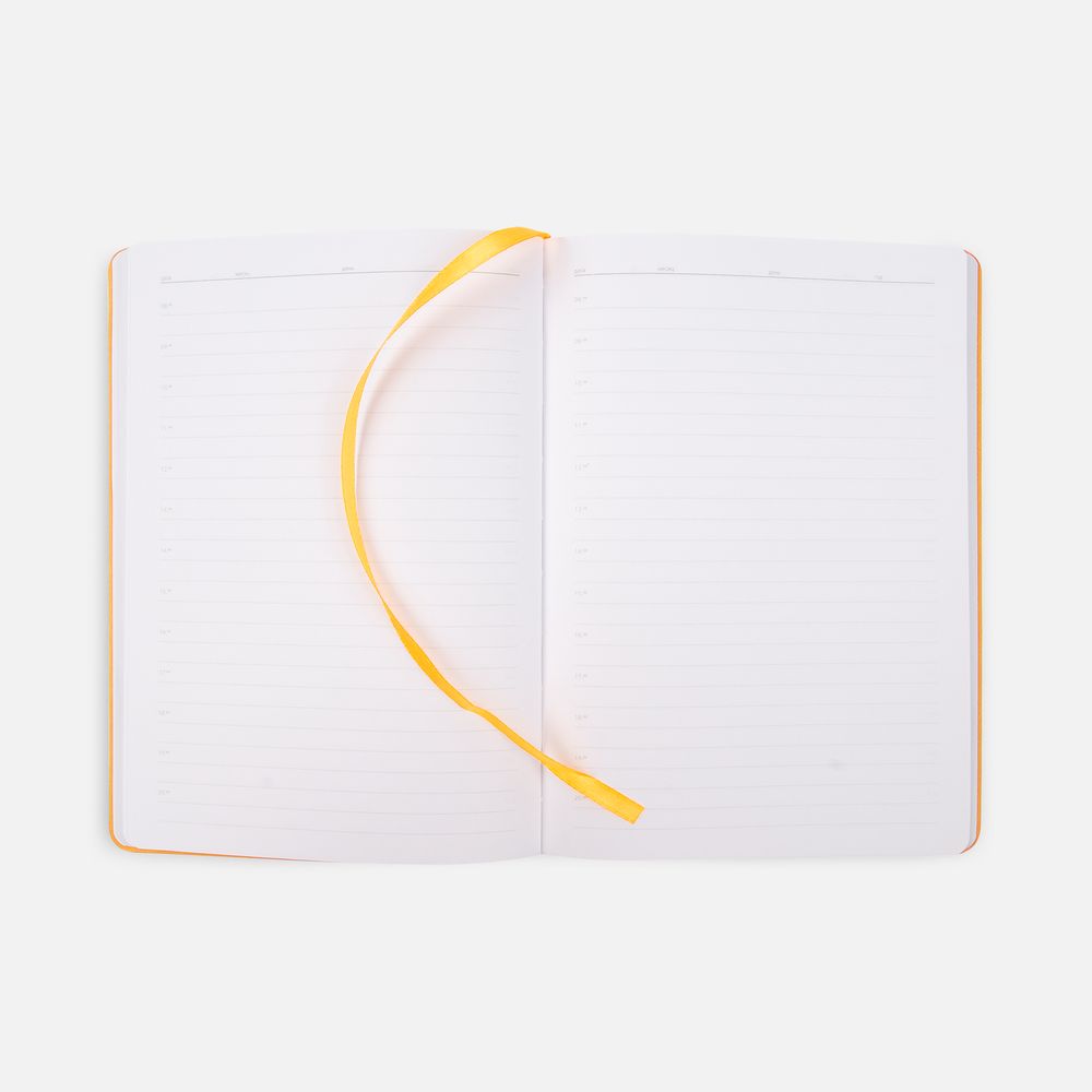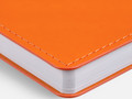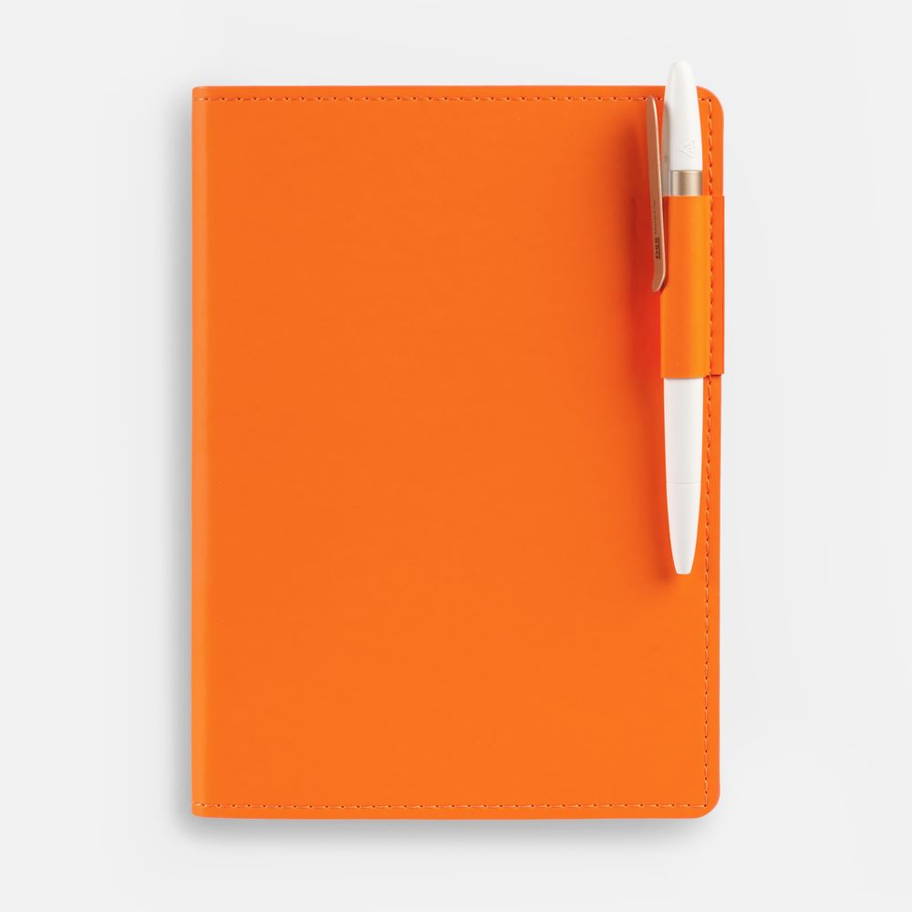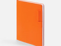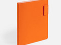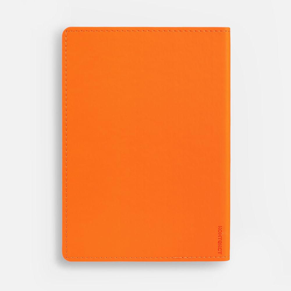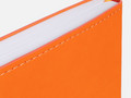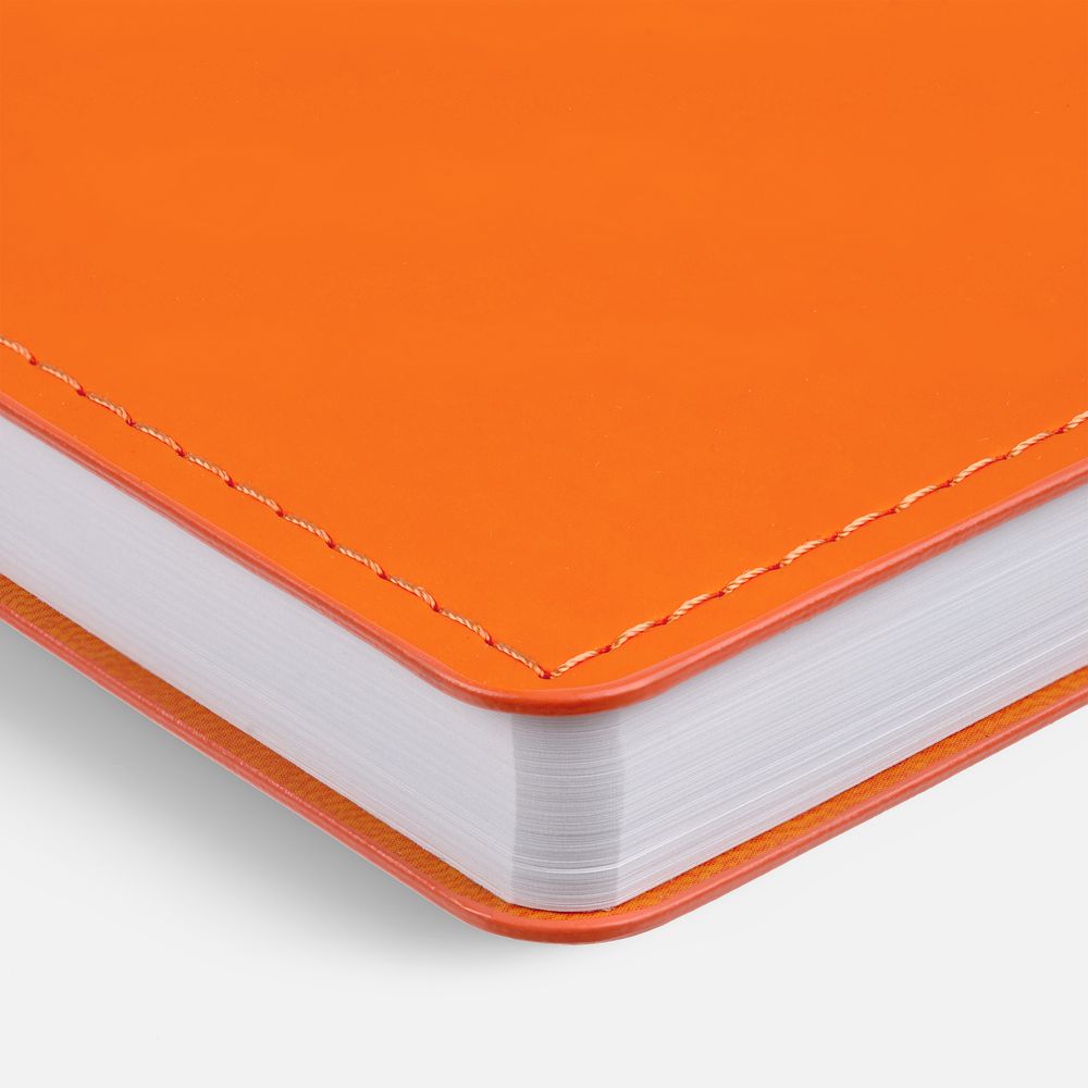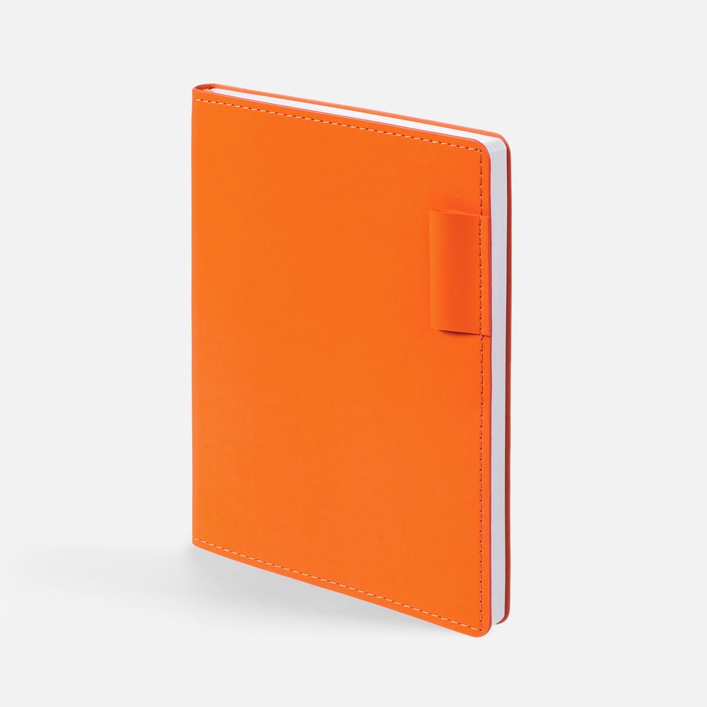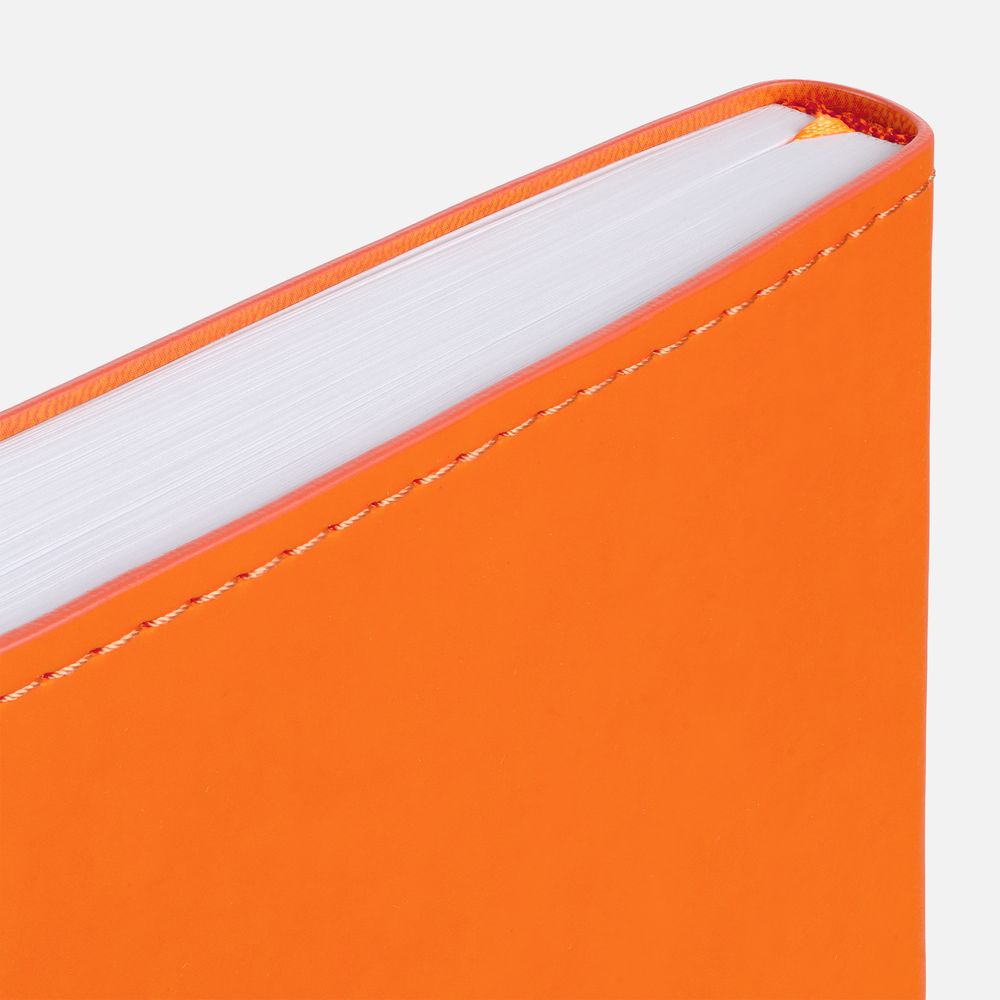 Ежедневник с гибкой обложкой из материала Soft Touch, оранжевый ОО и Latte, оранжевый ОО (внутренний материал), дополнен петелькой для ручки из покровного материала, капталом, ляссе и закрашенным срезом обложки в цвет материала.