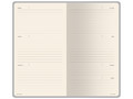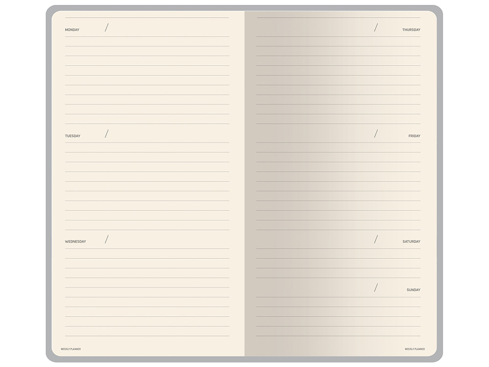 Внутри — недатированный блок формата А6 (84×160 мм) на бежевой бумаге 80 г/м². Книжный переплёт хорошо раскрывается, а скруглённые углы одновременно придают еженедельнику премиальный вид и защищают края при носке. Ляссе‑закладка выполнена в цвет обложки и помогает быстро находить нужную страницу. Тиснение (Блинт) на данный товар осуществляется бесплатно. Оплачивается только настройка оборудования в размере 8700 рублей на весь тираж.
