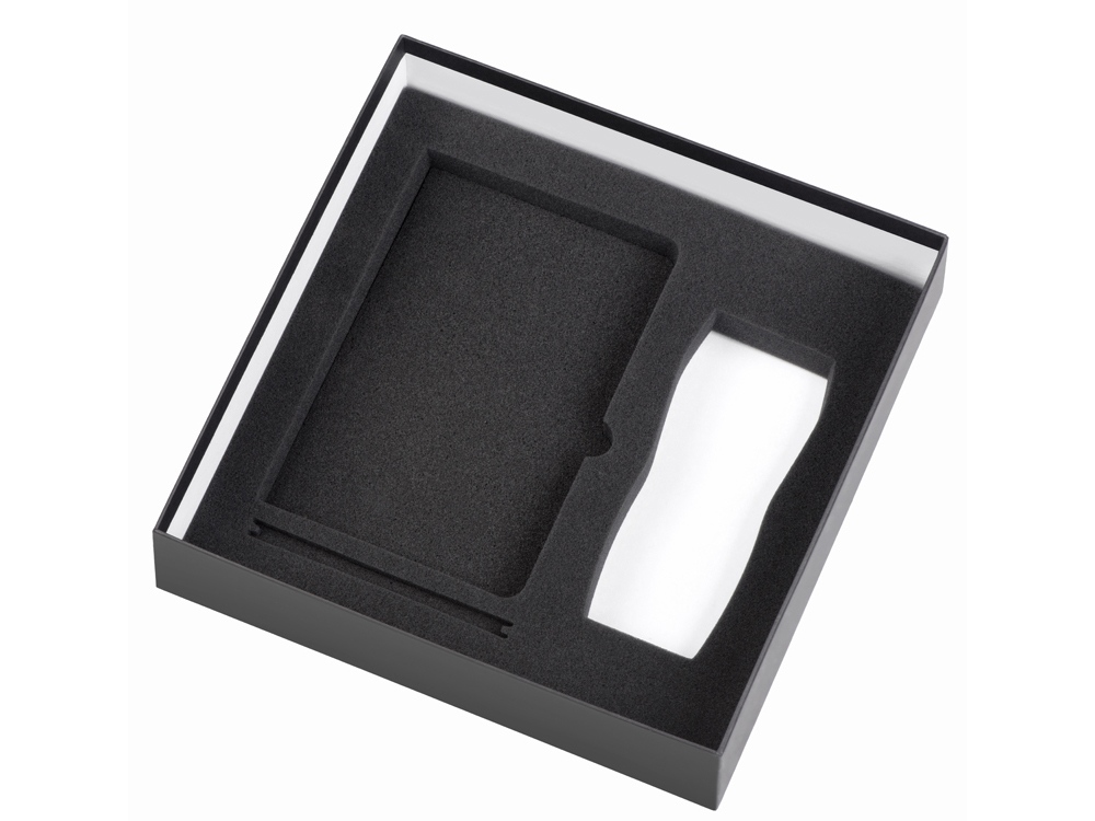 - подарочная упаковка из картона, оклеенного дизайнерской бумагой уже включена в набор. Трафаретная печать (1 цвет (цветные изделия)) на данный товар осуществляется бесплатно. Оплачивается только настройка оборудования в размере 10000 рублей на весь тираж.