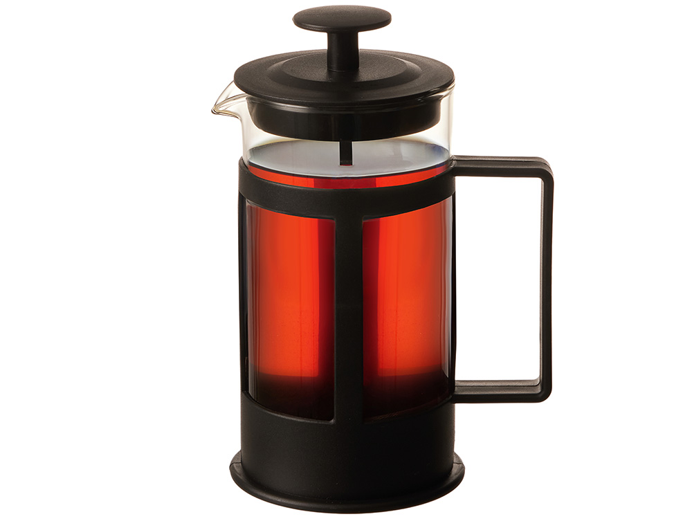 Этот кухонный прибор имеет плотно прилегающую пластиковую крышку, поршень из нержавеющей стали и пресс-фильтр с уплотнительным кольцом из пластика для отделения чайных листьев от воды.