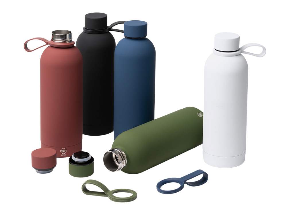Термобутылка из переработанной нержавеющей стали 304. Мягкая прорезиненная поверхность на корпусе. Удобная силиконовая ручка для переноски. Оснащена противокапельной системой благодаря силиконовому кольцу, встроенному во внутреннюю часть крышки. Крышка и ручка соответствуют цвету корпуса. Объем: 500 мл.