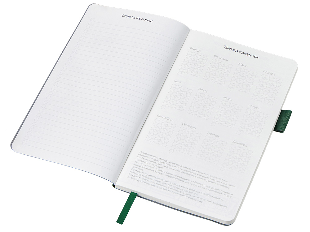 Необычный для блокнота вводный блок включает трекер привычек, списки книг и фильмов, а также 4 страницы для раскрашивания с картинками и мандалами.