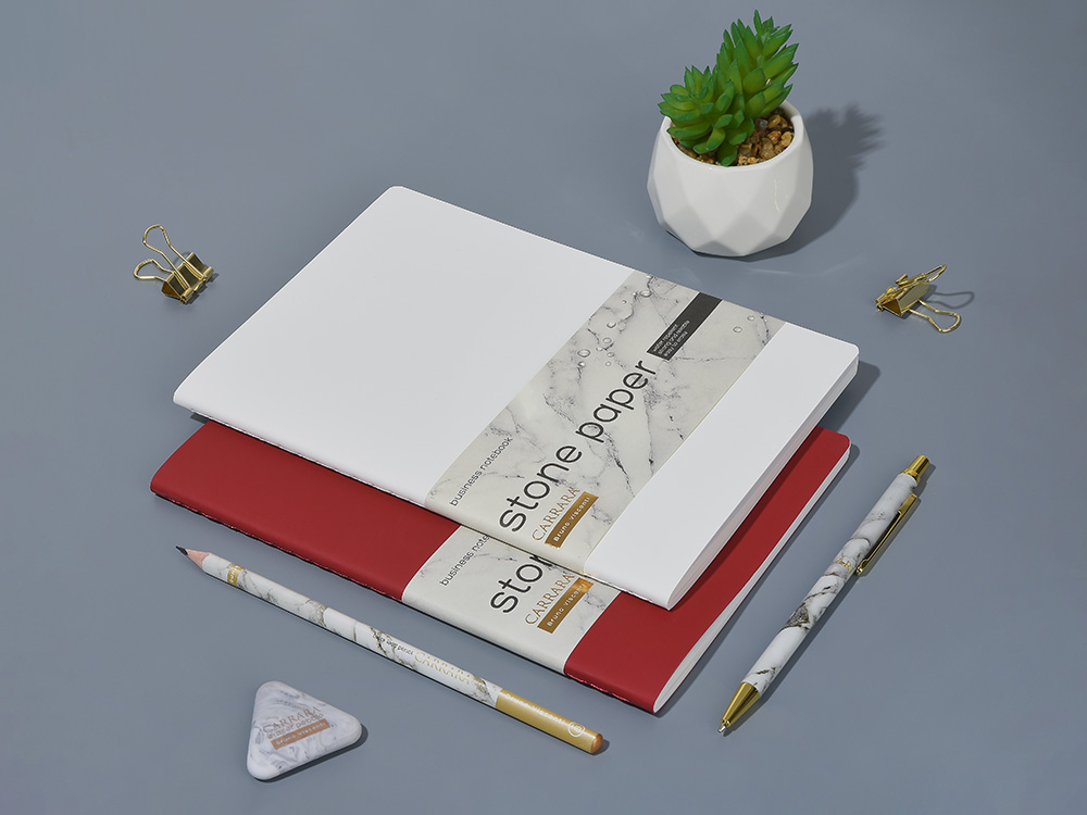 Блок изготовлен из каменной бумаги плотностью 144 г/кв.м, которая отличается особой гладкостью и повышенной прочностью. Она не боится воды, достаточно просто протереть сухой салфеткой. Тиснение (Блинт) на данный товар осуществляется бесплатно. Оплачивается только настройка оборудования в размере 8700 рублей на весь тираж.