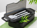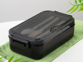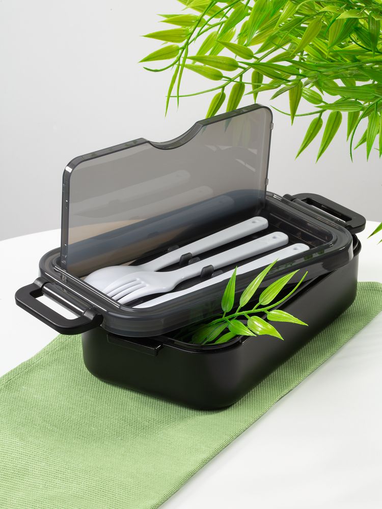 Удобная конструкция с крышкой на защелках обеспечивает надежную фиксацию. Специальное отделение под крышкой позволяет хранить столовые приборы, освобождая дополнительное пространство в сумке.