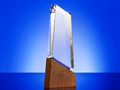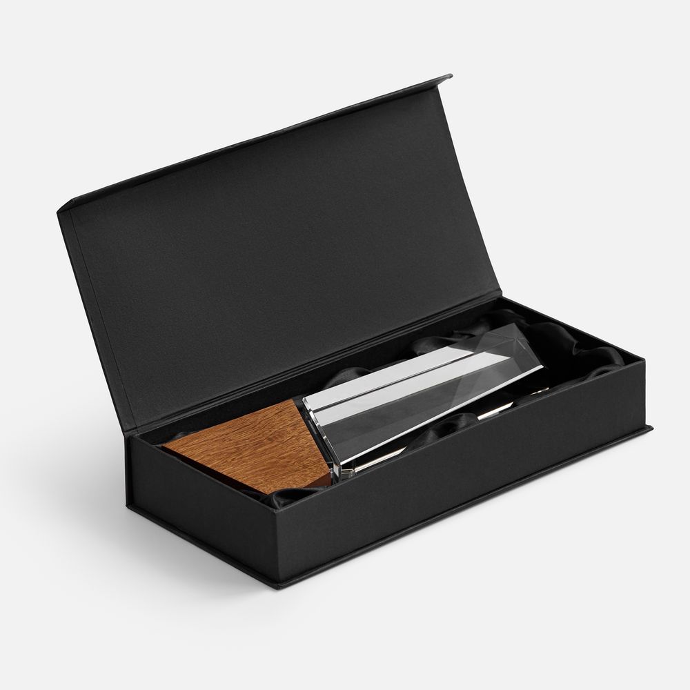 Стела изготовлена из стекла К9, в основе которого лежит оптическое боросиликатное стекло. Эту марку стекла отличает низкий процент посторонних включений, высокий показатель преломления и высокая прозрачность — идеальные качества для изготовления наград премиального уровня.