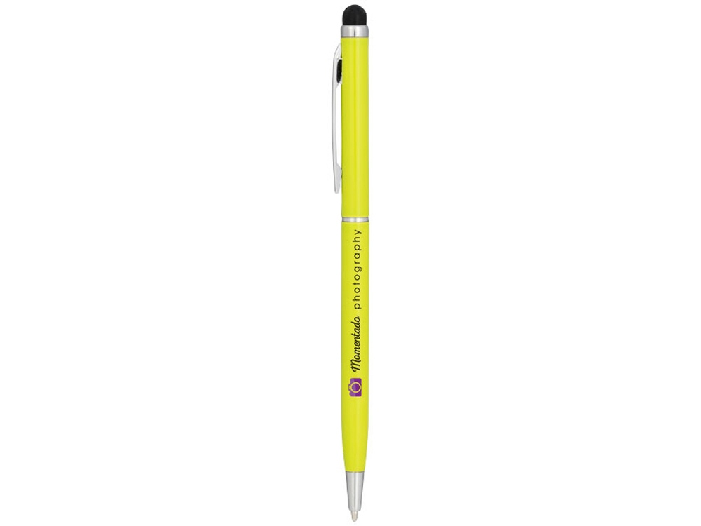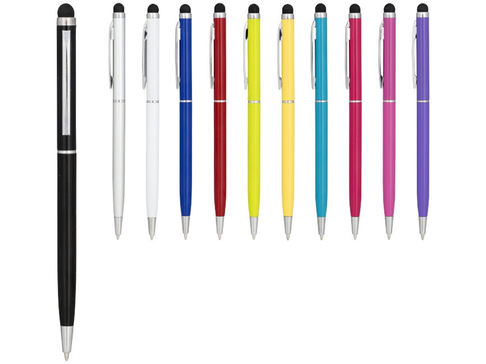 Алюминиевая шариковая ручка Joyce. Тонкая алюминиевая шариковая ручка с поворотным механизмом и стилусом. Алюминиевый корпус с металлическим зажимом и кольцом посередине, остальные элементы из пластика. Гравировка (оптоволоконный лазер) (Без чернения) на данный товар осуществляется бесплатно. Оплачивается только настройка оборудования в размере 2700 рублей на весь тираж.