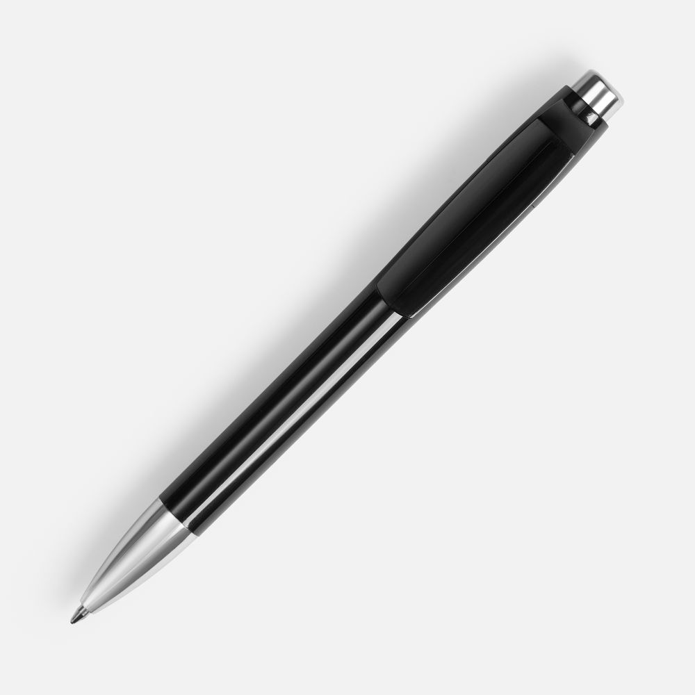 Пластиковая ручка с глянцевым корпусом и хромированными деталями. Большой клип идеален для нанесения логотипа компании.