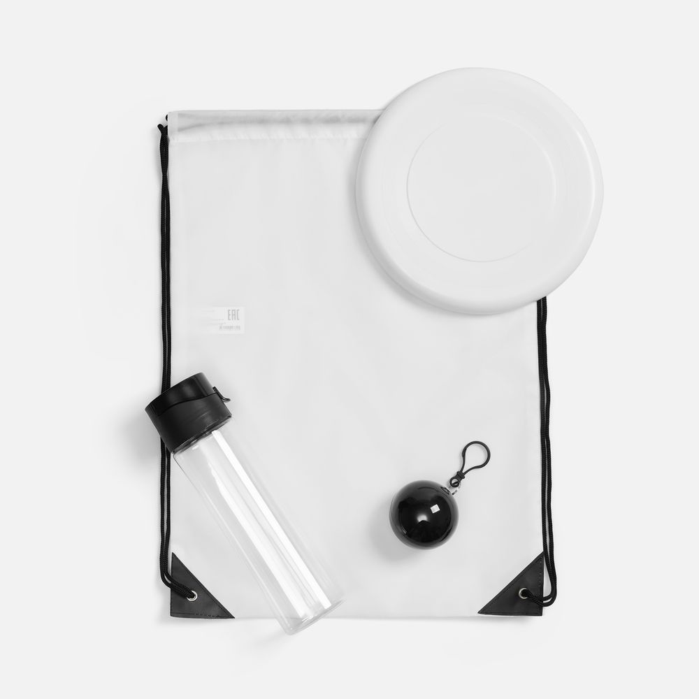 - Практичность — бутылка, тарелка-фрисби и дождевик в футляре решают базовые потребности на отдыхе.