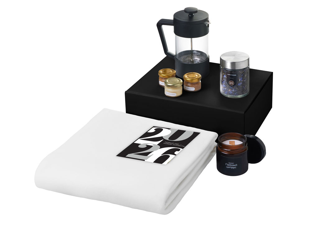 Подарочный набор c пледом, френчпрессом, чаем и медом, белый