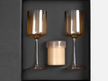 Два элегантных фужера из прозрачного стекла с тонкими ножками подчеркивают блеск любимого вина или шампанского, а ароматическая свеча в стильном стеклянном подсвечнике с крышкой дарит уютный свет и наполняет пространство нежным ароматом.
