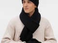Шапка с пышным помпоном и отворотом, связанная крупной резинкой, создает игривый силуэт, а широкий шарф с выразительной текстурой надежно защищает от ветра, сохраняя свободу движений. Варежки с отворотом-резинкой плотно облегают запястье, не пропуская холод.
