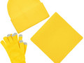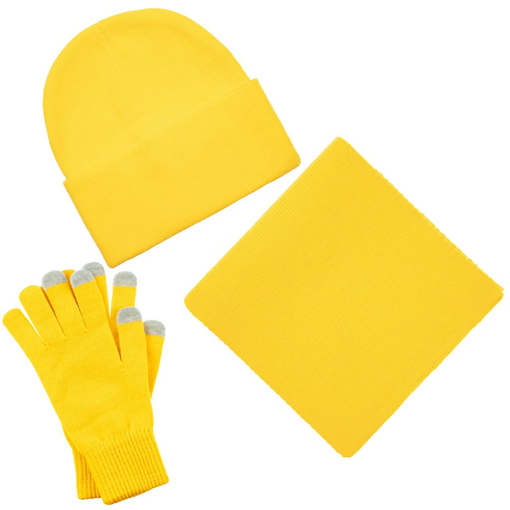 В комплект входят двухслойная шапка с регулируемым отворотом и легкий однослойный шарф из мягкой акриловой пряжи, сохраняющие тепло и защищающие от ветра, а также эргономичные перчатки со специальными токопроводящими волокнами на кончиках пальцев, позволяющие свободно пользоваться смартфоном даже в холодную погоду. Универсальная цветовая гамма и лаконичный дизайн делают набор органичным дополнением к любой верхней одежде.