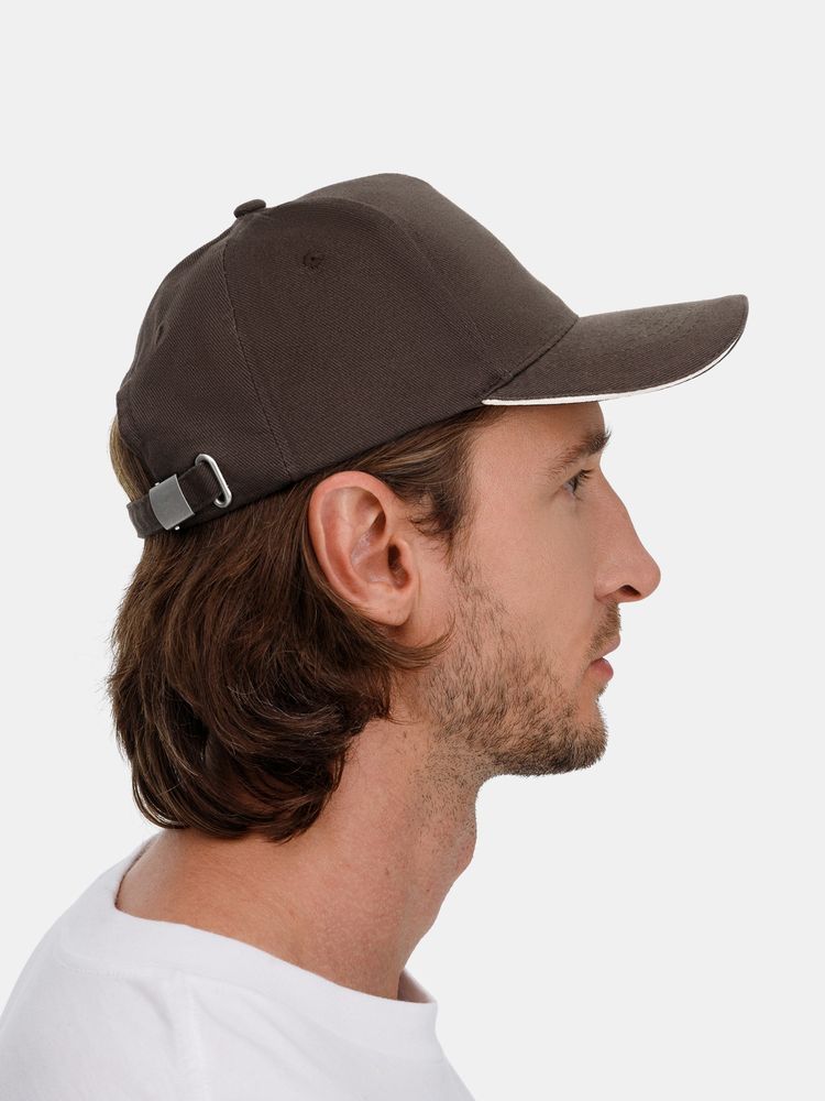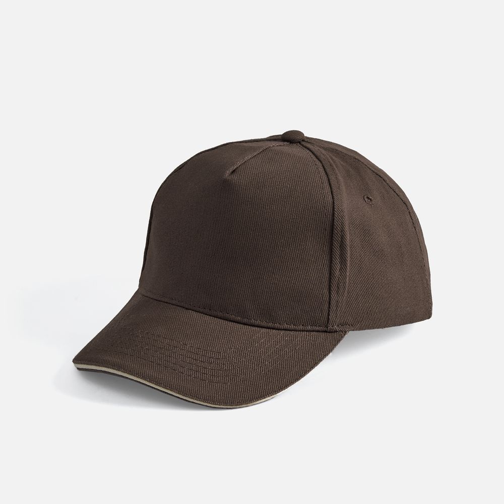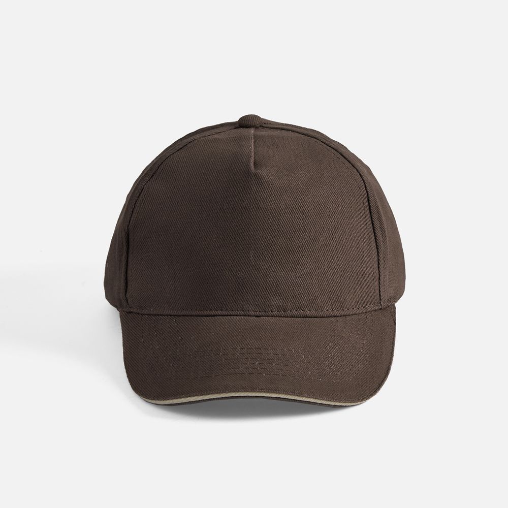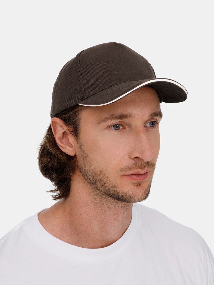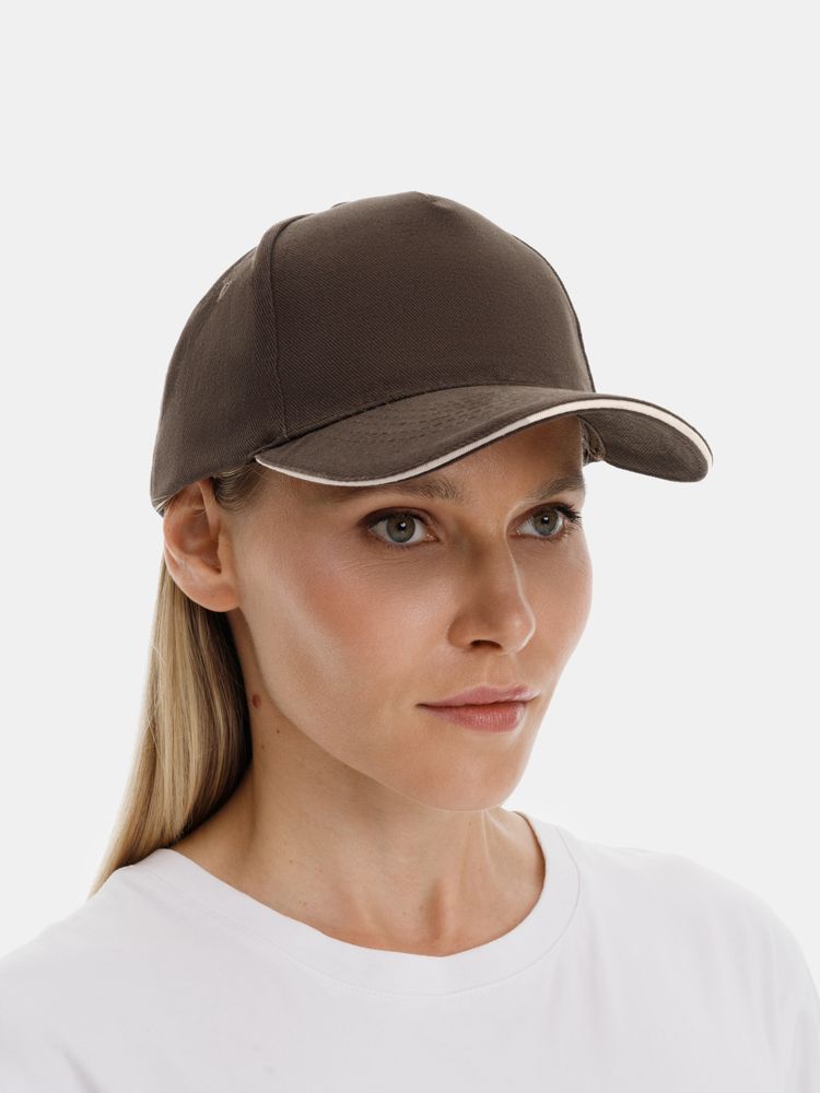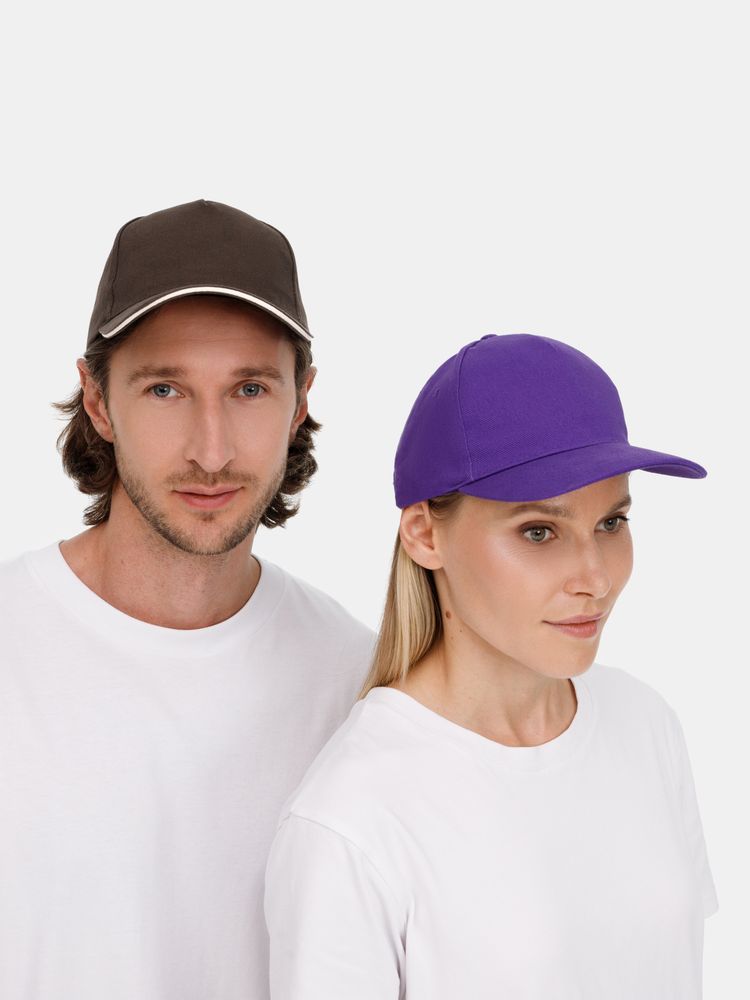 Модель бейсболки с 5-ю клиньями без лобового шва из плотного чесаного хлопка.