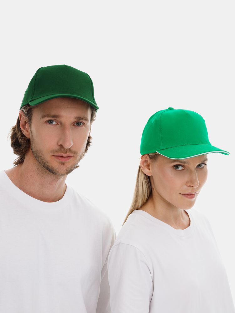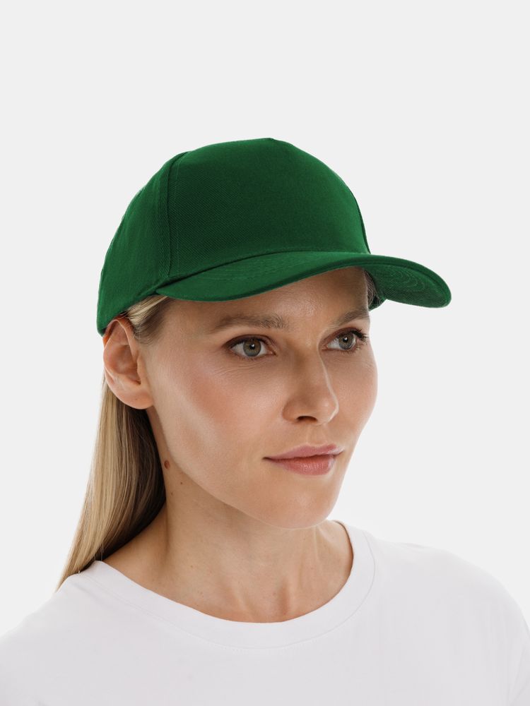 Модель бейсболки с 5-ю клиньями без лобового шва из плотного чесаного хлопка.