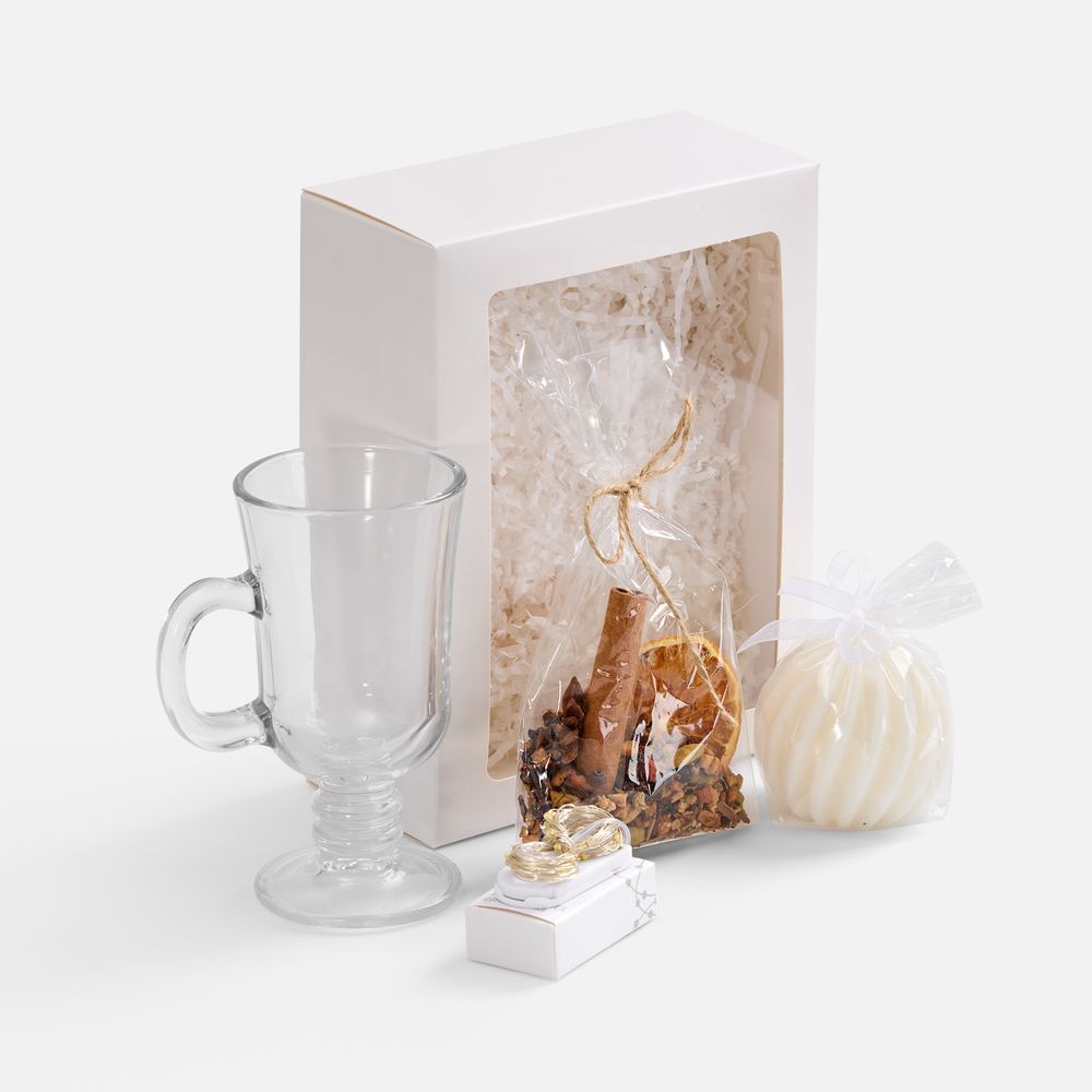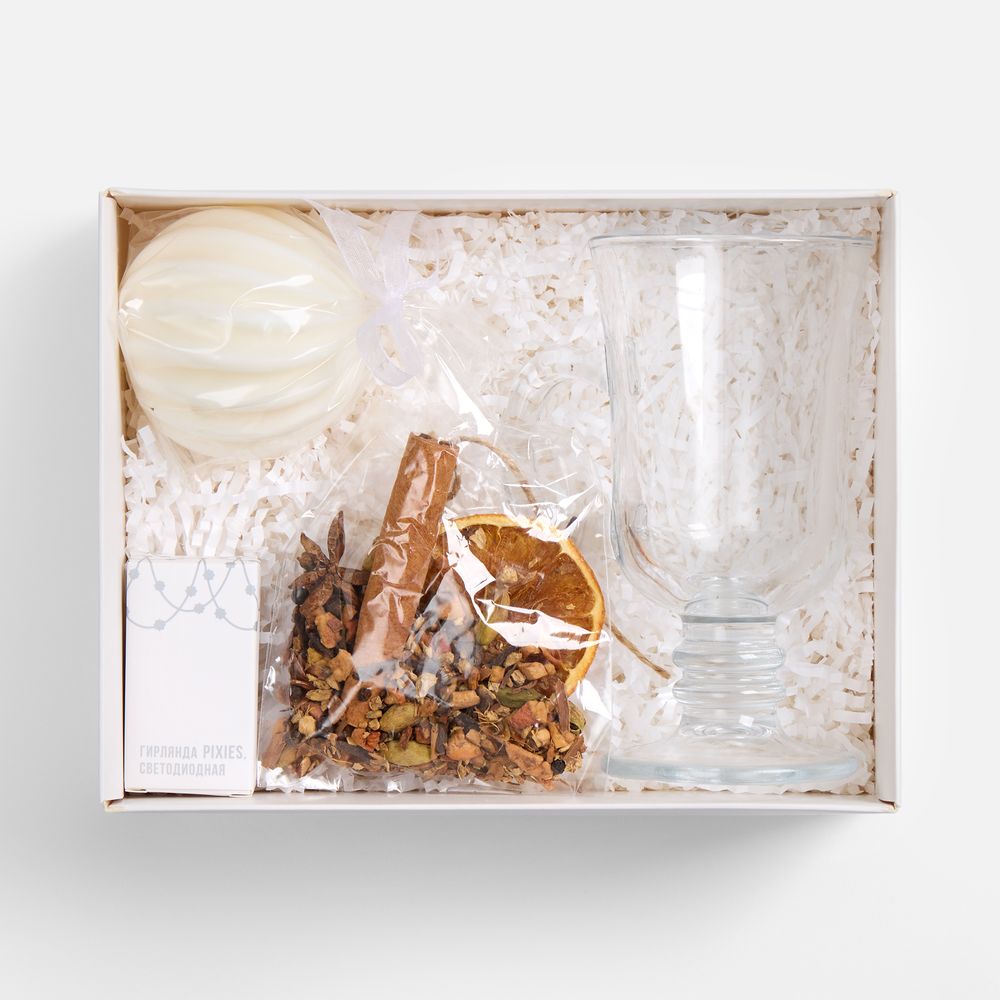 Помимо компонентов для приготовления любимого зимнего напитка здесь представлены главные новогодние атрибуты — для атмосферного оформления и праздничного настроения. Мягкий свет свечи и теплое мерцание гирлянды сделают вечер незабываемым!