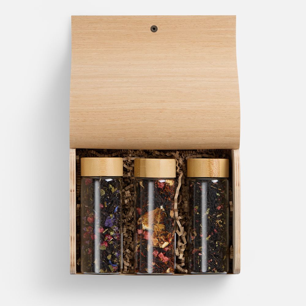 Изысканный набор из трех черных чаев в элегантной шкатулке из шпона.