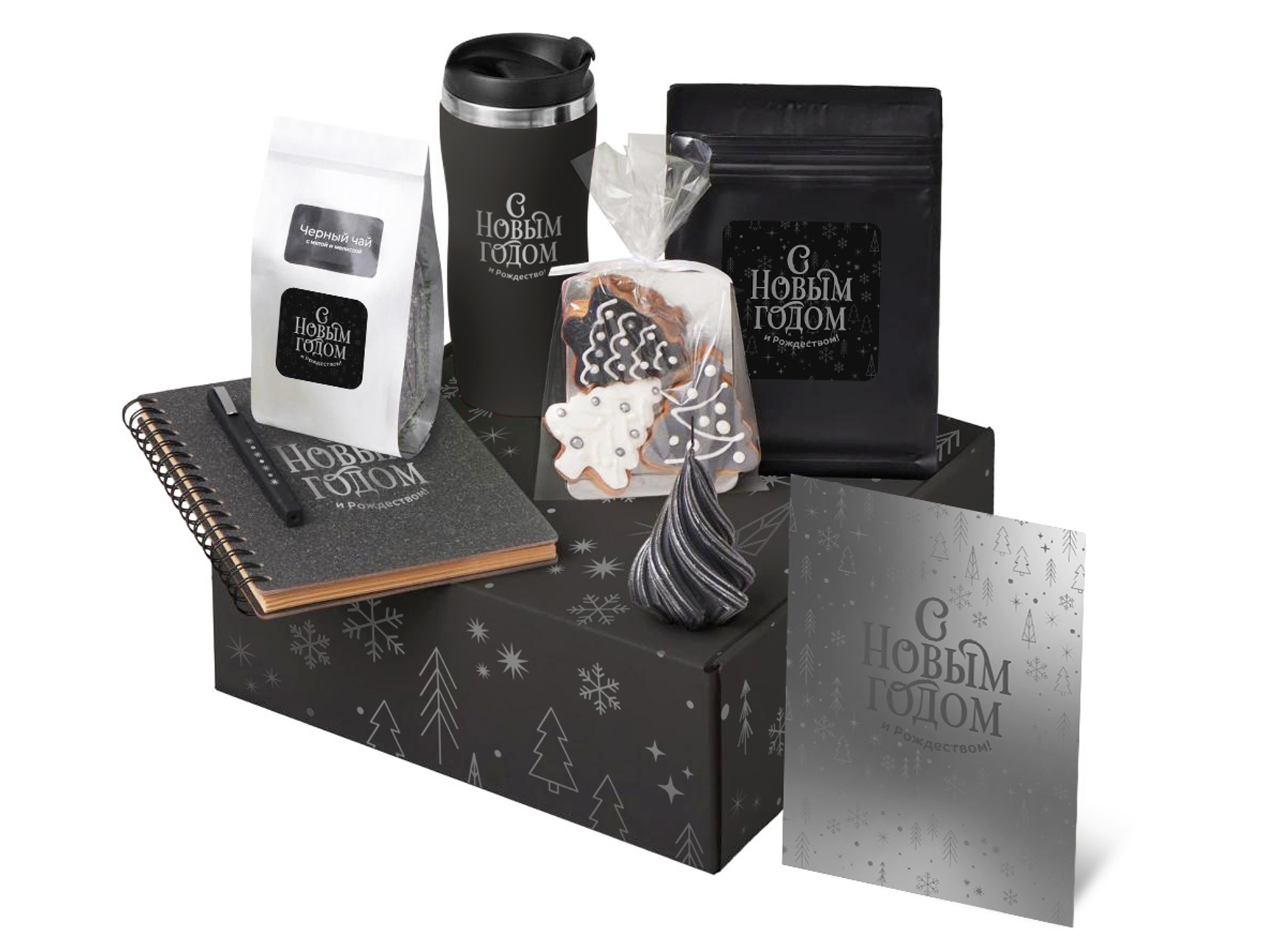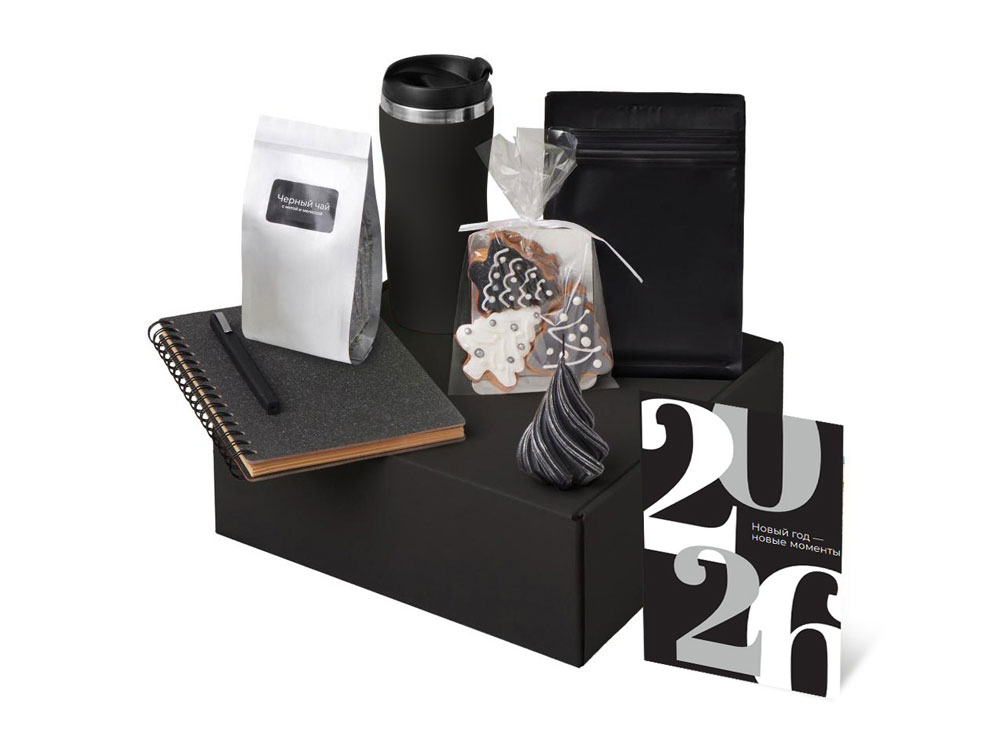 Подарочный набор c термокружкой, чаем, кофе и блокнотом, черный