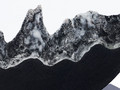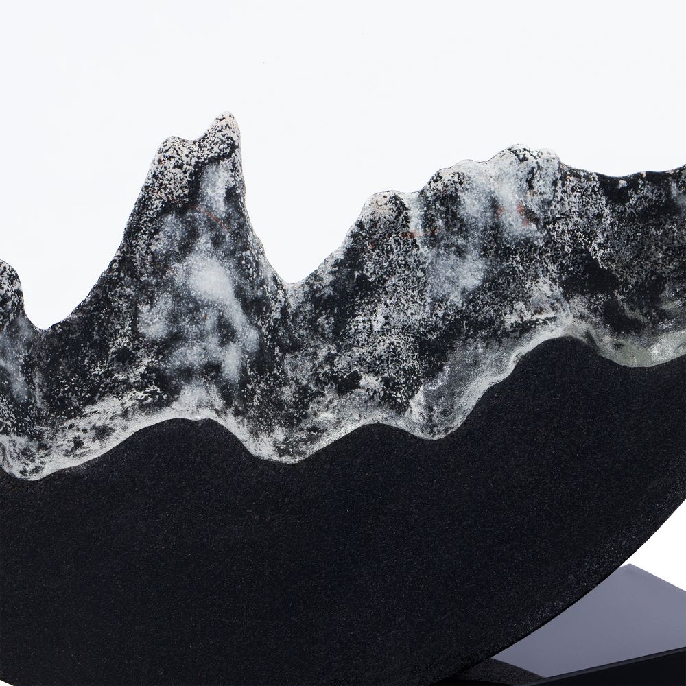 Нижняя часть стелы выполнена при помощи каменного литья из смеси специальной смолы с кварцевым черным и белым песком, тщательно отшлифованной после спекания при низкой температуре. Такой технологический прием создает завораживающую картинку внутри самой стелы, напоминающую горный хребет: яркий символ как преодоления, так и умиротворения.