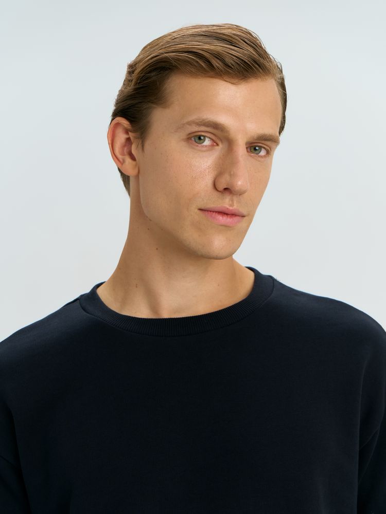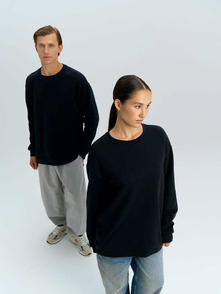 Свитшот унисекс со спущенным плечом и удлиненной спинкой.