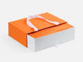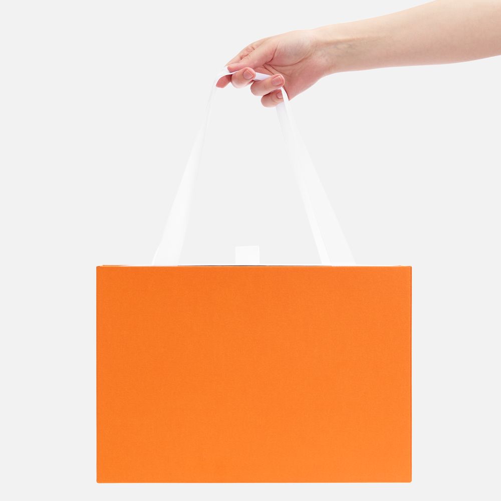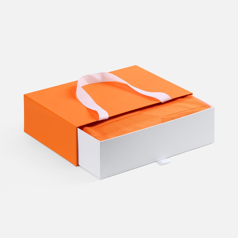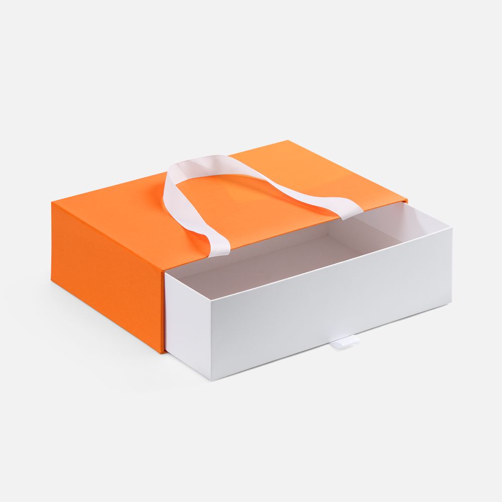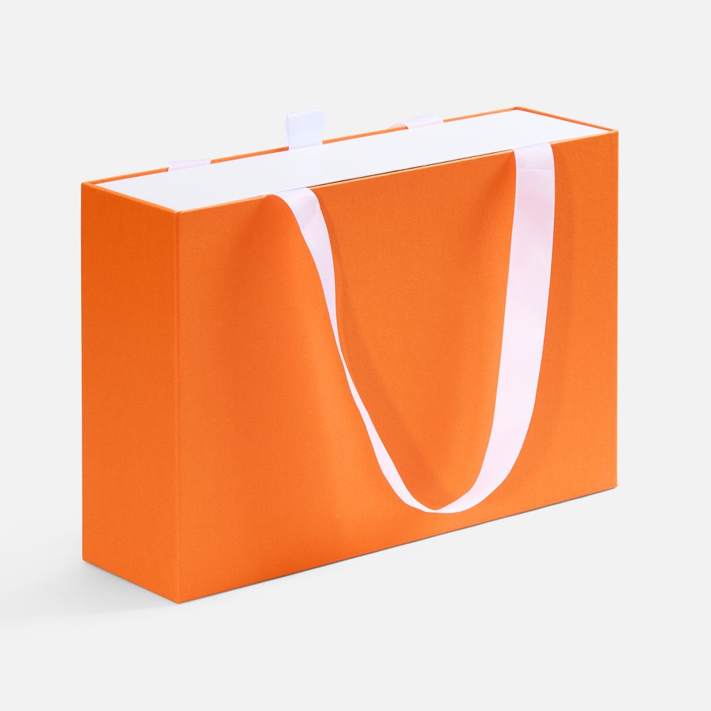 Внешний короб каширован дизайнерской бумаги и оснащен прочными ручками из репсовой ленты. Внутренний короб отделан белой бумагой, ламинированной матовой пленкой.