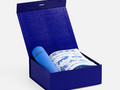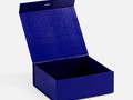 Коробка из переплетного картона с лайнером, ламинированым полуглянцевой текстурной пленкой устойчив к царапинам. Крышка на двух магнитах дополнительно фиксируется репсовой лентой.Толщина картона 2 мм.